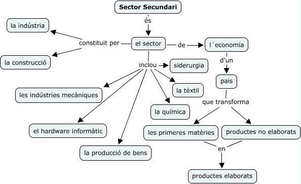 Este mapa conceptual tiene información relacionada a: Sector secundari 3ra Oli4, Charlene, Cristi, Andres, el sector inclou la producció de bens, Sector Secundari és el sector, el sector constituit per la construcció, el sector inclou la química, el sector inclou les indústries mecàniques, productes no elaborats en productes elaborats, pais que transforma les primeres matèries, el sector inclou la tèxtil, les primeres matèries en productes elaborats, el sector constituit per la indústria, el sector inclou siderurgia, el sector inclou el hardware informàtic, l´economia d'un pais, pais que transforma productes no elaborats, el sector de l´economia