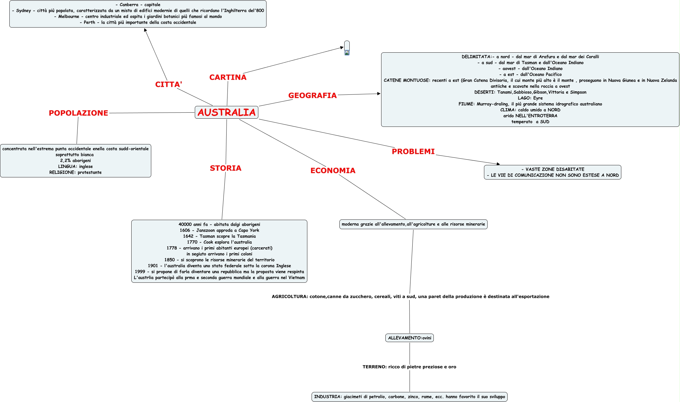 Questa Cmap, creata con IHMC CmapTools, contiene informazioni relative a: MAPPA ESAME EUSTRALIA GIULIA V, AUSTRALIA PROBLEMI - VASTE ZONE DISABITATE - LE VIE DI COMUNICAZIONE NON SONO ESTESE A NORD, AUSTRALIA ECONOMIA moderna grazie all'allevamento,all'agricolture e alle risorse minerarie, AUSTRALIA CARTINA, moderna grazie all'allevamento,all'agricolture e alle risorse minerarie AGRICOLTURA: cotone,canne da zucchero, cereali, viti a sud, una paret della produzione è destinata all'esportazione ALLEVAMENTO:ovini, AUSTRALIA POPOLAZIONE concentrata nell'estrema punta occidentale enella costa sudd-orientale soprattutto bianca 2,2% aborigeni LINGUA: inglese RELIGIONE: protestante, ALLEVAMENTO:ovini TERRENO: ricco di pietre preziose e oro INDUSTRIA: giacimeti di petrolio, carbone, zinco, rame, ecc. hanno favorito il suo sviluppo, AUSTRALIA CITTA' - Canberra - capitale - Sydney - città più popolata, caratterizzata da un misto di edifici modernie di quelli che ricordano l'Inghilterra del'800 - Melbourne - centro industriale ed ospita i giardini botanici più famosi al mondo - Perth - la città più importante della costa occidentale, AUSTRALIA GEOGRAFIA DELIMITATA:- a nord - dal mar di Arafura e dal mar dei Coralli - a sud - dal mar di Tasman e dall'Oceano Indiano - aovest - dall'Oceano Indiano - a est - dall'Oceano Pacifico CATENE MONTUOSE: recenti a est (Gran Catena Divisoria, il cui monte più alto è il monte , proseguono in Nuova Giunea e in Nuova Zelanda antiiche e scavate nella roccia a ovest DESERTI: Tanami,Sabbioso,Gibson,Vittoria e Simpson LAGO: Eyre FIUME: Murray-draling, il più grande sistema idrografico australiano CLIMA: caldo umido a NORD arido NELL'ENTROTERRA temperato a SUD, AUSTRALIA STORIA 40000 anni fa - abitata dalgi aborigeni 1606 - Janszoon approda a Capo York 1642 - Tasman scopre la Tasmania 1770 - Cook esplora l'australia 1778 - arrivano i primi abitanti europei (carcerati) in segiuto arrivano i primi coloni 1850 - si scoprono le risorse minerarie del territorio 1901 - l'australia diventa uno stato federale sotto la corona Inglese 1999 - si propone di farla diventare una repubblica ma la proposta viene respinta L'austrlia partecipò alla prma e seconda guerra mondiale e alla guerra nel Vietnam