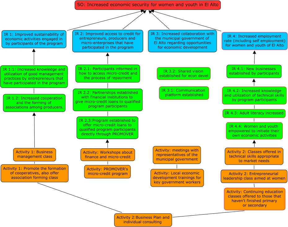 This Concept Map, created with IHMC CmapTools, has information related to: PROMOVER Results Framework v2, IR 4.2: Increased knowledge and utilization of technical skills by program participants IR 4.1: New businesses established by participants, IR 2.1: Participants informed in how to access micro-credit and the process of repayment IR 2: Improved access to credit for entrepreneurs, producers and micro-enterprises that have participated in the program, Activity 1: Business management class IR 1.2: Increased cooperation and the forming of associations among producers., Activity 2: Entrepreneurial leadership class aimed at women Activity 2: Classes offered in technical skills appropriate to market needs, IR 4: Increased employment rate (including self employment) for women and youth of El Alto SO: Increased economic security for women and youth in El Alto, IR 4.4: Women and youth empowered to initiate their own economic activities IR 4.3: Adult literacy increased, Activity: Local economic development trainings for key government workers Activity: meetings with representatives of the municipal government, IR 1.2: Increased cooperation and the forming of associations among producers. IR 1.1: Increased knowledge and utilization of good management practices by entrepreneurs that have participated in the program, IR 4.1: New businesses established by participants IR 4: Increased employment rate (including self employment) for women and youth of El Alto, Activity: Continuing education classes offered to those that haven't finished primary or secondary Activity 2: Entrepreneurial leadership class aimed at women, Activity: Workshops about finance and micro-credit IR 2.3:Program established to offer micro-credit loans to qualified program participants directly through PROMOVER, Activity 2: Classes offered in technical skills appropriate to market needs IR 4.4: Women and youth empowered to initiate their own economic activities, IR 2: Improved access to credit for entrepreneurs, producers and micro-enterprises that have participated in the program SO: Increased economic security for women and youth in El Alto, Activity 1: Promote the formation of cooperatives, also offer association forming class Activity 1: Business management class, Activity 2:Business Plan and individual consulting Activity: Continuing education classes offered to those that haven't finished primary or secondary, Activity 2:Business Plan and individual consulting Activity 1: Promote the formation of cooperatives, also offer association forming class, IR 3: Increased collaboration with the municipal government of El Alto regarding opportunities for economic development SO: Increased economic security for women and youth in El Alto, IR 2.3:Program established to offer micro-credit loans to qualified program participants directly through PROMOVER IR 2.2: Partnerships established with financial institutions to give micro-credit loans to qualified program participants, IR 2.2: Partnerships established with financial institutions to give micro-credit loans to qualified program participants IR 2.1: Participants informed in how to access micro-credit and the process of repayment, Activity: PROMOVER's micro-credit program Activity: Workshops about finance and micro-credit