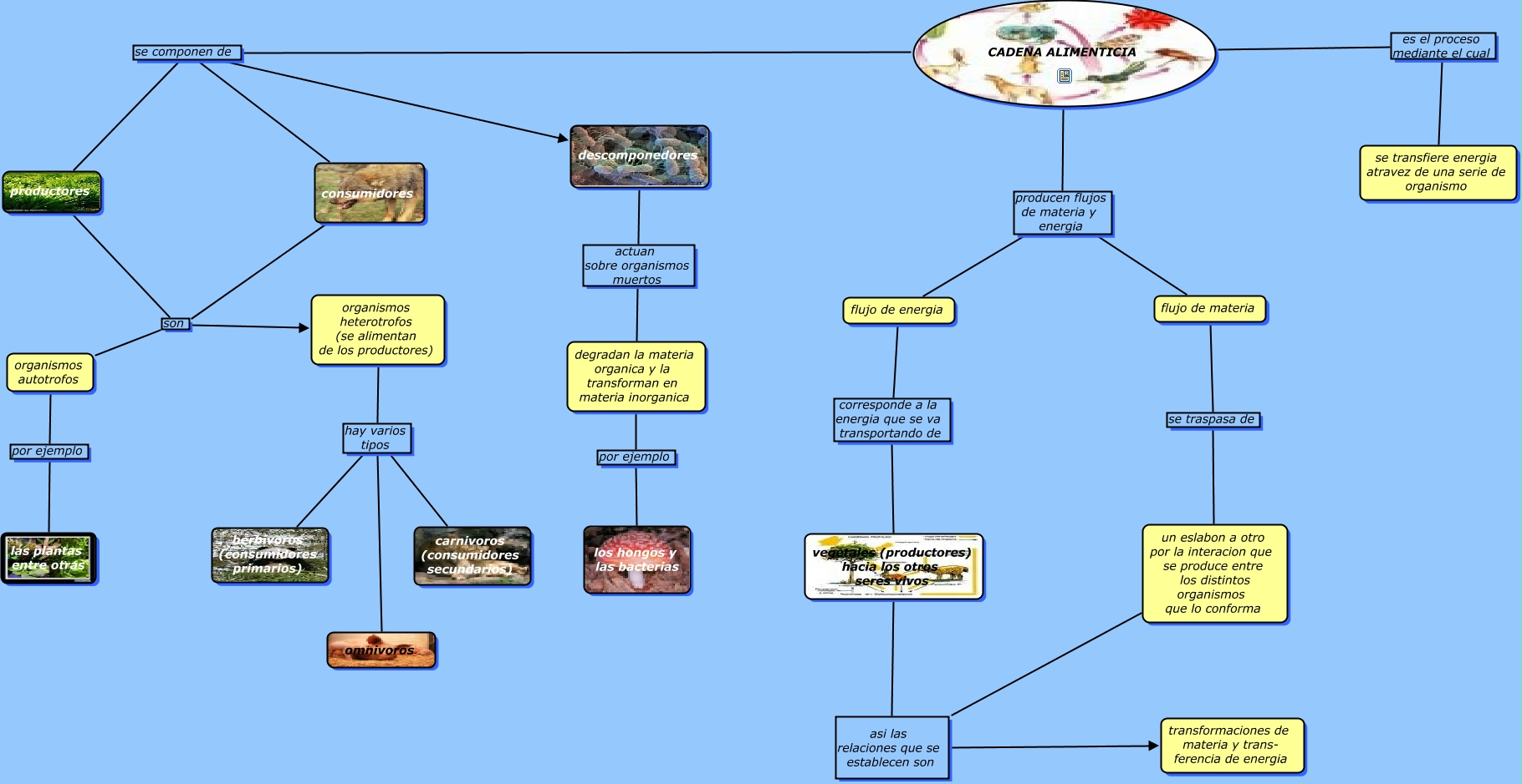 Este Cmap, tiene información relacionada con: cadena alimenticia, un eslabon a otro por la interacion que se produce entre los distintos organismos que lo conforma asi las relaciones que se establecen son transformaciones de materia y trans- ferencia de energia, organismos heterotrofos (se alimentan de los productores) hay varios tipos herbivoros (consumidores primarios), consumidores son organismos autotrofos, CADENA ALIMENTICIA se componen de consumidores, organismos heterotrofos (se alimentan de los productores) hay varios tipos omnivoros, flujo de energia corresponde a la energia que se va transportando de vegetales (productores) hacia los otros seres vivos, CADENA ALIMENTICIA producen flujos de materia y energia flujo de energia, descomponedores actuan sobre organismos muertos degradan la materia organica y la transforman en materia inorganica, CADENA ALIMENTICIA producen flujos de materia y energia flujo de materia, degradan la materia organica y la transforman en materia inorganica por ejemplo los hongos y las bacterias, CADENA ALIMENTICIA se componen de descomponedores, productores son organismos heterotrofos (se alimentan de los productores), organismos heterotrofos (se alimentan de los productores) hay varios tipos carnivoros (consumidores secundarios), organismos autotrofos por ejemplo las plantas entre otras, CADENA ALIMENTICIA es el proceso mediante el cual se transfiere energia atravez de una serie de organismo, consumidores son organismos heterotrofos (se alimentan de los productores), flujo de materia se traspasa de un eslabon a otro por la interacion que se produce entre los distintos organismos que lo conforma, vegetales (productores) hacia los otros seres vivos asi las relaciones que se establecen son transformaciones de materia y trans- ferencia de energia, CADENA ALIMENTICIA se componen de productores, productores son organismos autotrofos