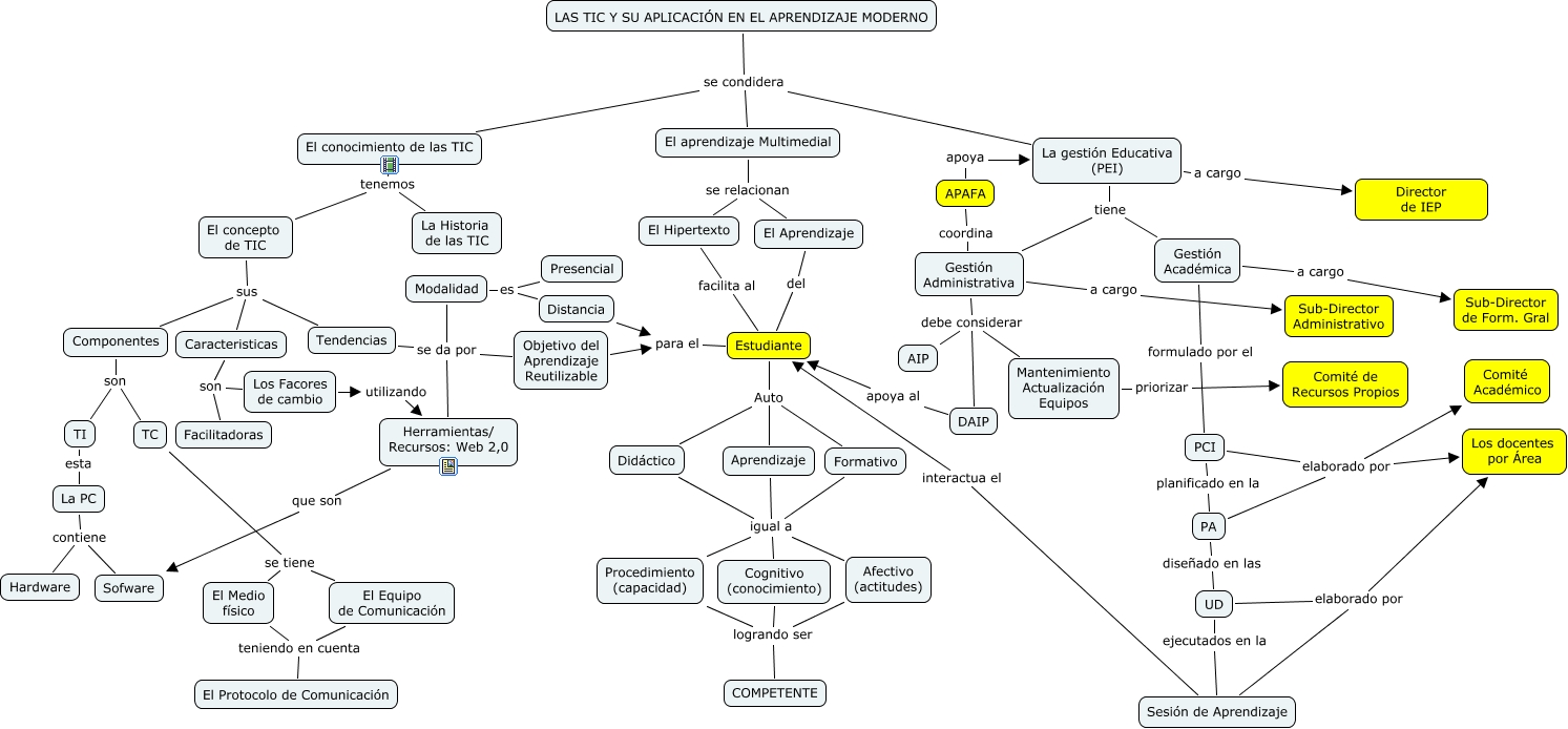 Este Cmap, tiene información relacionada con: LAS TIC EN EL APRENDIZAJE, Objetivo del Aprendizaje Reutilizable para el Estudiante, Procedimiento (capacidad) logrando ser Afectivo (actitudes), PA elaborado por Comité Académico, Herramientas/ Recursos: Web 2,0 se da por Tendencias, Caracteristicas son Facilitadoras, Modalidad es Presencial, El Medio físico teniendo en cuenta El Protocolo de Comunicación, Objetivo del Aprendizaje Reutilizable se da por Tendencias, El concepto de TIC sus Tendencias, PCI planificado en la PA, Procedimiento (capacidad) logrando ser COMPETENTE, Sesión de Aprendizaje elaborado por UD, Gestión Administrativa a cargo Sub-Director Administrativo, TC se tiene El Medio físico, Gestión Académica a cargo Sub-Director de Form. Gral, Didáctico igual a Afectivo (actitudes), El conocimiento de las TIC tenemos El concepto de TIC, Estudiante Auto Formativo, LAS TIC Y SU APLICACIÓN EN EL APRENDIZAJE MODERNO se condidera El aprendizaje Multimedial, Estudiante Auto Aprendizaje