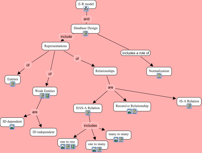 Esse mapa conceitual, produzido no IHMC CmapTools, tem a informação relacionada a: design using e-r_1, Relationships are HAS-A Relation, Relationships are IS-A Relation, HAS-A Relation includes many to many, Representations of Entities, HAS-A Relation includes one to many, Weak Entities are ID independent, HAS-A Relation includes one to one, Representations of Weak Entities, Database Design include Representations, Weak Entities are ID dependent, Representations of Relationships, Database Design includes a role of Normalization, Relationships are Recursive Relationship, E-R model and Database Design