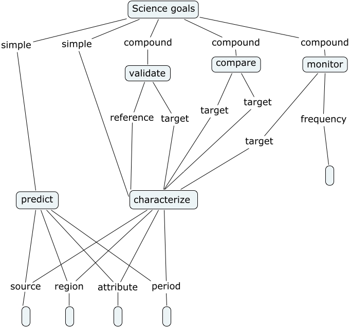 This Concept Map, created with IHMC CmapTools, has information related to: Science Goals, Science goals compound validate, validate target characterize, predict region, compare target characterize, predict source, Science goals simple predict, characterize attribute, Science goals compound compare, validate reference characterize, Science goals compound monitor, characterize region, characterize source, Science goals simple characterize, predict period, compare target characterize, characterize period, monitor frequency, predict attribute, monitor target characterize