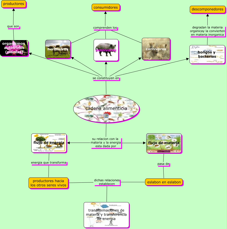 Este Cmap, tiene información relacionada con: cadena alimenticia 2, cadena alimenticia se constituyen en omnivoros, hongos y bacterias degradan la materia organicay la convierten en materia inorganica descomponedores, cadena alimenticia su relacion con la materia y la energia esta dada por flujo de materia, omnivoros comprenden los consumidores, organismos autotrofos (plantas) que son productores, flujo de energia energia que transforma productores hacia los otros seres vivos, cadena alimenticia su relacion con la materia y la energia esta dada por flujo de energia, flujo de materia pasa de eslabon en eslabon, productores hacia los otros seres vivos dichas relaciones establecen tranaformaciones de materia y transferencia de energia, cadena alimenticia se constituyen en carnivoros, cadena alimenticia se constituyen en herbivoros, herbivoros comprenden los consumidores, cadena alimenticia se constituyen en organismos autotrofos (plantas), cadena alimenticia se constituyen en hongos y bacterias, eslabon en eslabon dichas relaciones establecen tranaformaciones de materia y transferencia de energia, carnivoros comprenden los consumidores