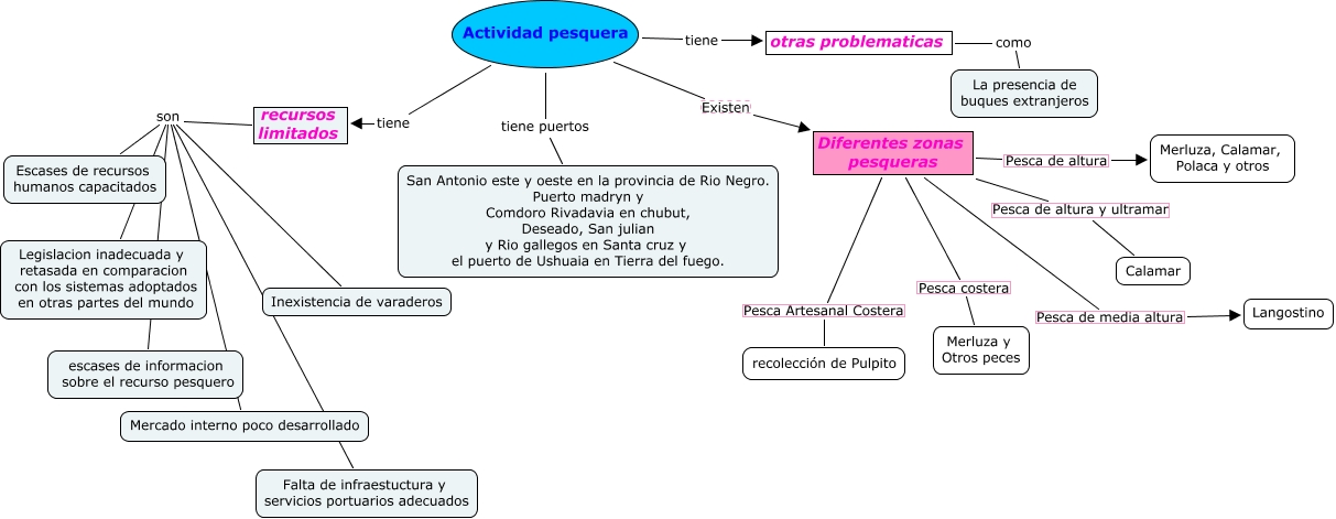 Este mapa conceptual tiene información relacionada a: Actividad Pesquera. RomeroTorres 42, Actividad pesquera tiene puertos San Antonio este y oeste en la provincia de Rio Negro. Puerto madryn y Comdoro Rivadavia en chubut, Deseado, San julian y Rio gallegos en Santa cruz y el puerto de Ushuaia en Tierra del fuego., recursos limitados son Escases de recursos humanos capacitados, Diferentes zonas pesqueras Pesca Artesanal Costera recolección de Pulpito, Actividad pesquera tiene recursos limitados, recursos limitados son Falta de infraestuctura y servicios portuarios adecuados, Diferentes zonas pesqueras Pesca costera Merluza y Otros peces, Diferentes zonas pesqueras Pesca de altura y ultramar Calamar, Actividad pesquera tiene otras problematicas, Actividad pesquera Existen Diferentes zonas pesqueras, recursos limitados son Legislacion inadecuada y retasada en comparacion con los sistemas adoptados en otras partes del mundo