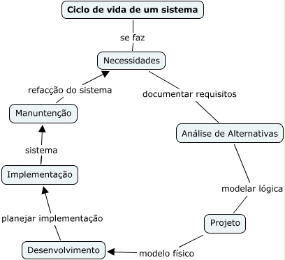 Esse mapa conceitual, produzido no IHMC CmapTools, tem a informação relacionada a: Ciclo de Vida de um Sistema, Implementação sistema Manuntenção, Projeto modelo físico Desenvolvimento, Análise de Alternativas modelar lógica Projeto, Desenvolvimento planejar implementação Implementação, Implementação sistema Manuntenção, Necessidades documentar requisitos Análise de Alternativas, Ciclo de vida de um sistema se faz Necessidades, Manuntenção refacção do sistema Necessidades