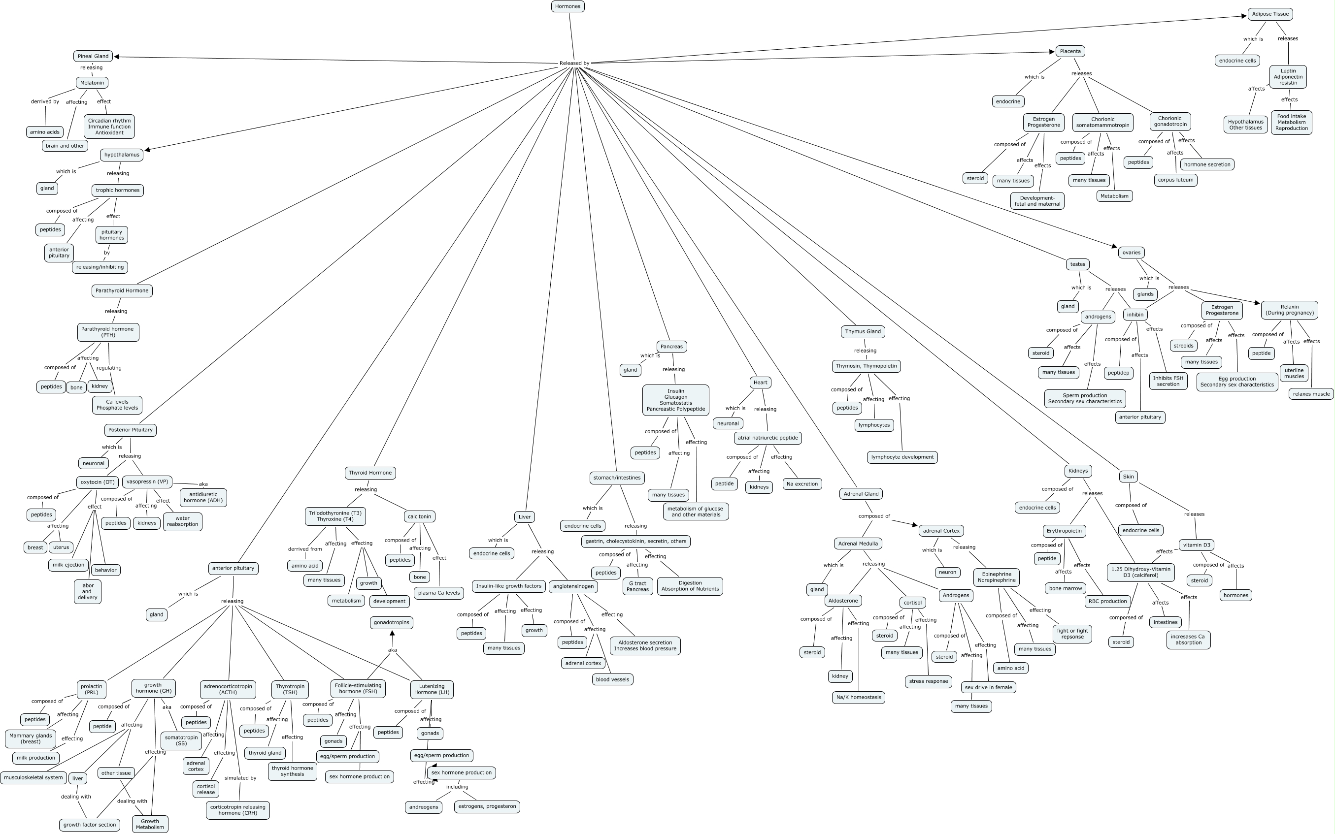 This Concept Map, created with IHMC CmapTools, has information related to: hormones- ch7, Melatonin derrived by amino acids, Hormones Released by Pineal Gland, angiotensinogen composed of peptides, Thyrotropin (TSH) affecting thyroid gland, Chorionic gonadotropin effects hormone secretion, Estrogen Progesterone composed of steroid, gastrin, cholecystokinin, secretin, others composed of peptides, growth hormone (GH) effecting Growth Metabolism, Kidneys composed of endocrine cells, Follicle-stimulating hormone (FSH) composed of peptides, Pancreas which is gland, Lutenizing Hormone (LH) composed of peptides, Melatonin affecting brain and other, Lutenizing Hormone (LH) affecting gonads, Hormones Released by Heart, prolactin (PRL) composed of peptides, Androgens effecting sex drive in female, Hormones Released by Placenta, Hormones Released by Adipose Tissue, Estrogen Progesterone effects Egg production Secondary sex characteristics