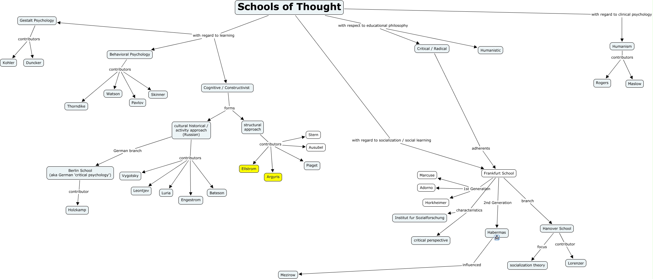 This Concept Map, created with IHMC CmapTools, has information related to: Schools of Thought OLD, Habermas influenced Mezirow, structural approach contributors Ausubel, cultural historical / activity approach (Russian) contributors Bateson, Gestalt Psychology contributors Duncker, Hanover School contributor Lorenzer, Schools of Thought with regard to socialization / social learning Frankfurt School, structural approach contributors Ellstrom, structural approach contributors Stern, Frankfurt School 1st Generation Adorno, Behavioral Psychology contributors Thorndike, Behavioral Psychology contributors Watson, Berlin School (aka German 'critical psychology') contributor Holzkamp, Critical / Radical adherents Frankfurt School, Frankfurt School characteristics critical perspective, Schools of Thought with regard to learning Gestalt Psychology, Gestalt Psychology contributors Kohler, Schools of Thought with regard to clinical psychology Humanism, Behavioral Psychology contributors Pavlov, Schools of Thought with respect to educational philosophy Critical / Radical, Schools of Thought with regard to learning Behavioral Psychology
