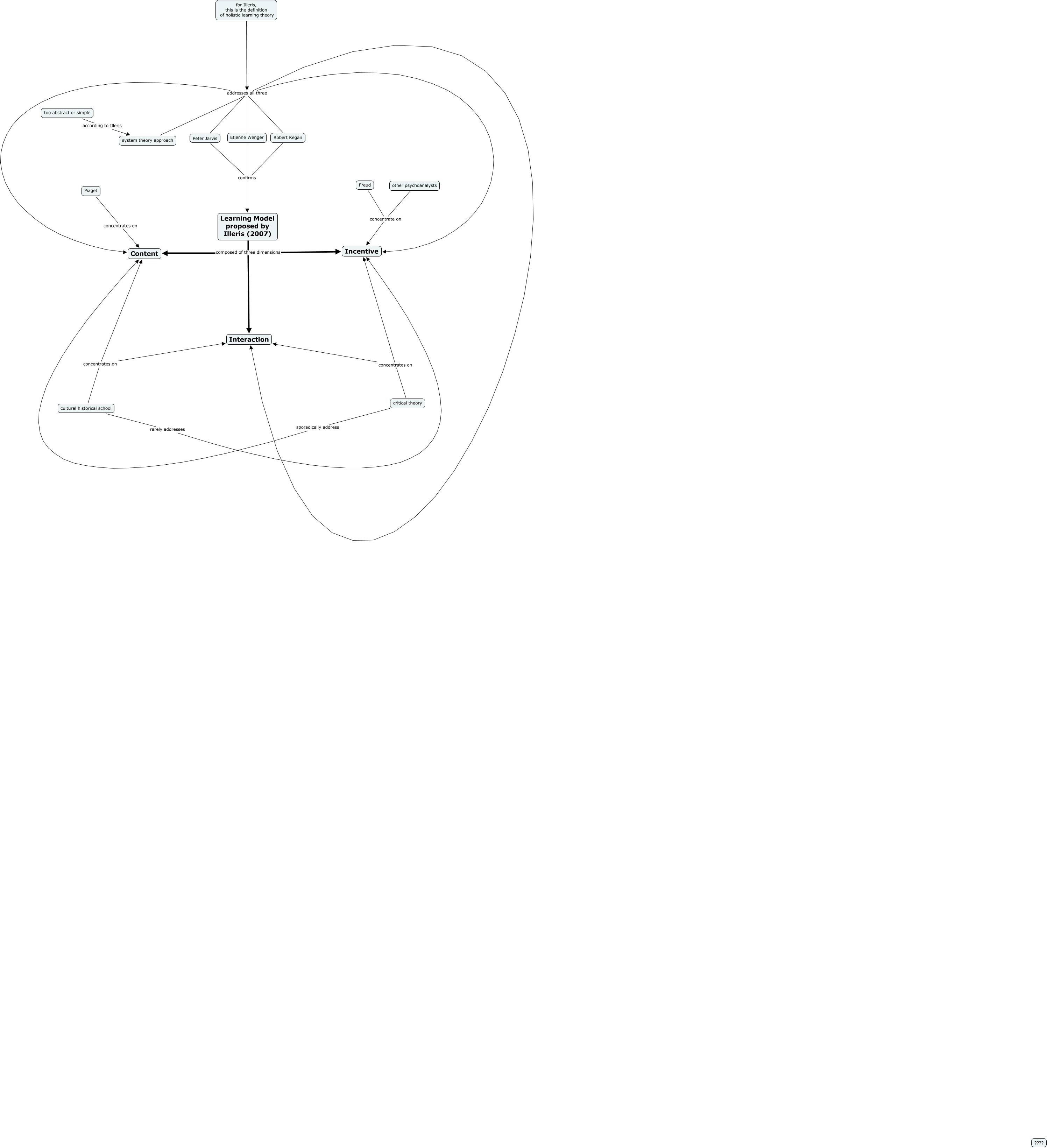 This Concept Map, created with IHMC CmapTools, has information related to: Illeris' Learning Model compared with other learning theorists old, Etienne Wenger addresses all three Incentive, Learning Model proposed by Illeris (2007) composed of three dimensions Incentive, Etienne Wenger addresses all three Content, system theory approach addresses all three Incentive, critical theory concentrates on Incentive, Peter Jarvis confirms Learning Model proposed by Illeris (2007), Etienne Wenger confirms Learning Model proposed by Illeris (2007), critical theory concentrates on Interaction, too abstract or simple according to Illeris system theory approach, for Illeris, this is the definition of holistic learning theory addresses all three Incentive, Peter Jarvis addresses all three Content, cultural historical school rarely addresses Incentive, other psychoanalysts concentrate on Incentive, cultural historical school concentrates on Interaction, critical theory sporadically address Content, Learning Model proposed by Illeris (2007) composed of three dimensions Interaction, Robert Kegan addresses all three Interaction, cultural historical school concentrates on Content, for Illeris, this is the definition of holistic learning theory addresses all three Interaction, Robert Kegan addresses all three Content