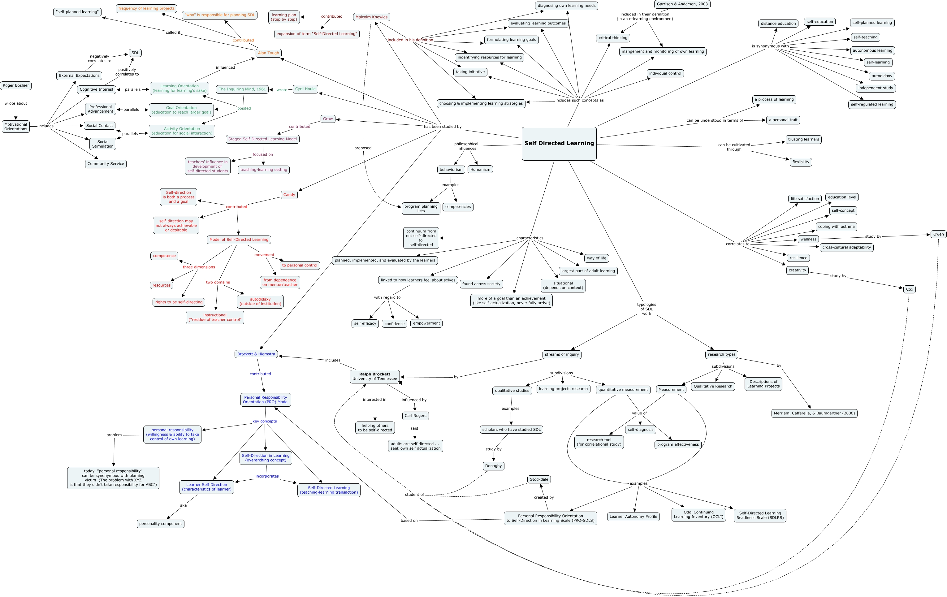 This Concept Map, created with IHMC CmapTools, has information related to: Self Directed Learning, Self Directed Learning can be cultivated through trusting learners, Self Directed Learning includes such concepts as critical thinking, quantitative measurement examples Learner Autonomy Profile, Self Directed Learning characteristics continuum from not self-directed to self-directed, Self-Direction in Learning (overarching concept) incorporates Self-Directed Learning (teaching-learning transaction), Cognitive Interest positively correlates to SDL, Malcolm Knowles contributed learning plan (step by step), Self Directed Learning characteristics situational (depends on context), research types subdivisions Descriptions of Learning Projects, personal responsibility (willingness & ability to take control of own learning) problem today, "personal responsibility" can be synonymous with blaming victim (The problem with XYZ is that they didn't take responsibility for ABC"), Self Directed Learning correlates to coping with asthma, Self Directed Learning characteristics linked to how learners feel about selves, Self Directed Learning can be understood in terms of a process of learning, Personal Responsibility Orientation (PRO) Model key concepts Self-Directed Learning (teaching-learning transaction), Self Directed Learning includes such concepts as taking initiative, Brockett & Hiemstra contributed Personal Responsibility Orientation (PRO) Model, Measurement examples Learner Autonomy Profile, Alan Tough contributed frequency of learning projects, Self Directed Learning has been studied by Candy, Measurement examples Self-Directed Learning Readiness Scale (SDLRS)