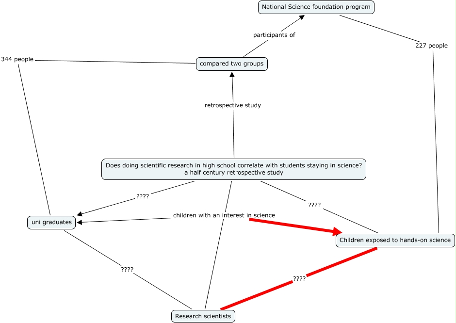 This Concept Map, created with IHMC CmapTools, has information related to: does doing scientific research in high school correlate with students staying in science, National Science foundation program 227 people ????, uni graduates ???? Research scientists, Does doing scientific research in high school correlate with students staying in science? a half century retrospective study ???? uni graduates, Children exposed to hands-on science ???? Research scientists, Does doing scientific research in high school correlate with students staying in science? a half century retrospective study children with an interest in science Children exposed to hands-on science, Does doing scientific research in high school correlate with students staying in science? a half century retrospective study children with an interest in science Research scientists, compared two groups 344 people uni graduates, Does doing scientific research in high school correlate with students staying in science? a half century retrospective study ???? Children exposed to hands-on science, Does doing scientific research in high school correlate with students staying in science? a half century retrospective study retrospective study compared two groups, Does doing scientific research in high school correlate with students staying in science? a half century retrospective study children with an interest in science uni graduates, compared two groups participants of National Science foundation program