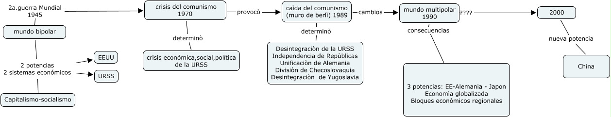 Este mapa conceptual tiene información relacionada a: Cambios políticos y territoriales, mundo multipolar 1990 consecuencias 3 potencias: EE-Alemania - Japon Economìa globalizada Bloques econòmicos regionales, mundo multipolar 1990 ???? 2000, caìda del comunismo (muro de berlì) 1989 determinò Desintegraciòn de la URSS Independencia de Repùblicas Unificaciòn de Alemania Divisiòn de Checoslovaquia Desintegraciòn de Yugoslavia, 2000 nueva potencia China, crisis del comunismo 1970 provocò caìda del comunismo (muro de berlì) 1989, mundo bipolar 2a.guerra Mundial 1945 crisis del comunismo 1970, mundo bipolar 2 potencias 2 sistemas económicos Capitalismo-socialismo, mundo bipolar 2 potencias 2 sistemas económicos EEUU, crisis del comunismo 1970 determinò crisis económica,social,política de la URSS, caìda del comunismo (muro de berlì) 1989 cambios mundo multipolar 1990