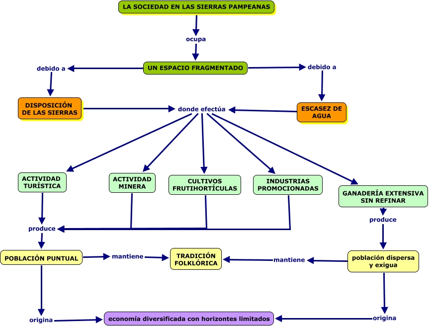 Este mapa conceptual tiene información relacionada a: Sierras pampeana, LA SOCIEDAD EN LAS SIERRAS PAMPEANAS ocupa UN ESPACIO FRAGMENTADO, INDUSTRIAS PROMOCIONADAS produce POBLACIÓN PUNTUAL, UN ESPACIO FRAGMENTADO debido a ESCASEZ DE AGUA, ESCASEZ DE AGUA donde efectúa INDUSTRIAS PROMOCIONADAS, CULTIVOS FRUTIHORTÍCULAS produce POBLACIÓN PUNTUAL, DISPOSICIÓN DE LAS SIERRAS donde efectúa INDUSTRIAS PROMOCIONADAS, población dispersa y exigua mantiene TRADICIÓN FOLKLÓRICA, POBLACIÓN PUNTUAL mantiene TRADICIÓN FOLKLÓRICA, ESCASEZ DE AGUA donde efectúa GANADERÍA EXTENSIVA SIN REFINAR, ESCASEZ DE AGUA donde efectúa CULTIVOS FRUTIHORTÍCULAS