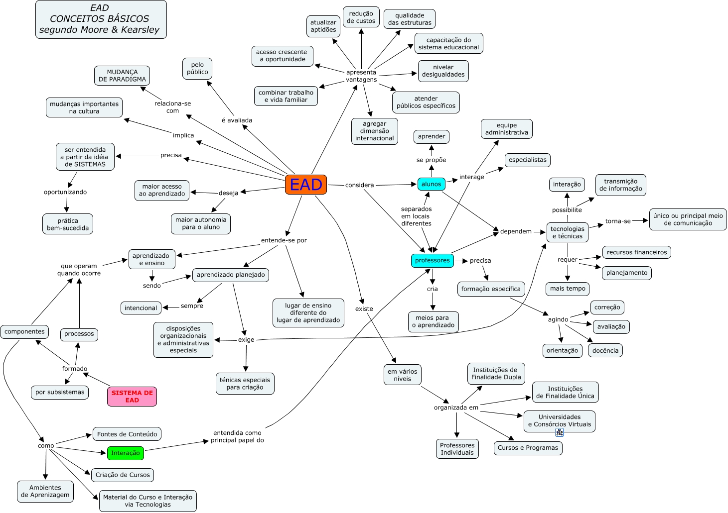 Este Mapa Conceitual tem informações relacionadas a: EAD Conceitos Básicos segundo Moore, aprendizado planejado exige ténicas especiais para criação, alunos dependem tecnologias e técnicas, componentes como Interação, componentes como Fontes de Conteúdo, em vários níveis organizada em Instituições de Finalidade Dupla, tecnologias e técnicas possibilite interação, formação específica agindo docência, alunos se propõe aprender, EAD apresenta vantagens capacitação do sistema educacional, EAD apresenta vantagens qualidade das estruturas, em vários níveis organizada em Cursos e Programas, tecnologias e técnicas possibilite transmição de informação, EAD apresenta vantagens nivelar desigualdades, professores cria meios para o aprendizado, componentes como Material do Curso e Interação via Tecnologias, em vários níveis organizada em Universidades e Consórcios Virtuais, aprendizado e ensino sendo aprendizado planejado, EAD é avaliada pelo público, SISTEMA DE EAD formado processos, tecnologias e técnicas requer mais tempo