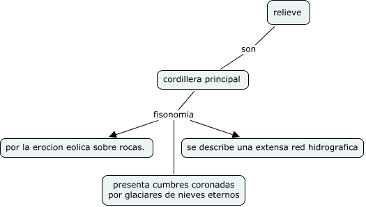 Este mapa conceptual tiene información relacionada a: RA 4°2°, cordillera principal fisonomia presenta cumbres coronadas por glaciares de nieves eternos, relieve son cordillera principal, cordillera principal fisonomia se describe una extensa red hidrografica, cordillera principal fisonomia por la erocion eolica sobre rocas.