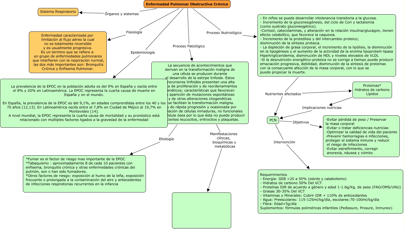 Este Cmap, tiene información relacionada con: EPOC, Enfermedad Pulmonar Obstructiva Crónica Órganos y sistemas Sistema Respiratorio, - En niños se puede desarrollar intolerancia transitoria a la glucosa. - Incremento de la gluconeogénesis, del ciclo de Cori y lactatemia (como sustrato gluconeogénico). -Cortisol, catecolaminas, y alteración en la relación insulina/glucagon, tienen efecto catabólico, que favorece la caquexia. - Incremento de la proteólisis y del intercambio proteico; disminución de la síntesis proteica. - La depleción de grasa corporal, el incremento de la lipólisis, la disminución en la lipogénesis y el aumento de la actividad de la enzima lipoproteín-lipasa Hipertrigliceridemia, disminución de HDL y niveles elevados de VLDL -Si la desnutrición energético-proteica no se corrige a tiempo puede producir emaciación progresiva, debilidad, disminución de la síntesis de proteínas con la consecuente afección de la masa corporal, con lo que se puede propiciar la muerte. Nutrientes afectados PCN, - En niños se puede desarrollar intolerancia transitoria a la glucosa. - Incremento de la gluconeogénesis, del ciclo de Cori y lactatemia (como sustrato gluconeogénico). -Cortisol, catecolaminas, y alteración en la relación insulina/glucagon, tienen efecto catabólico, que favorece la caquexia. - Incremento de la proteólisis y del intercambio proteico; disminución de la síntesis proteica. - La depleción de grasa corporal, el incremento de la lipólisis, la disminución en la lipogénesis y el aumento de la actividad de la enzima lipoproteín-lipasa Hipertrigliceridemia, disminución de HDL y niveles elevados de VLDL -Si la desnutrición energético-proteica no se corrige a tiempo puede producir emaciación progresiva, debilidad, disminución de la síntesis de proteínas con la consecuente afección de la masa corporal, con lo que se puede propiciar la muerte. Nutrientes afectados Proteínas* Hidratos de carbono Lípidos, La secuencia de acontecimientos que derivan en la transformación maligna de una célula se producen durante el desarrollo de la estirpe linfoide. Estos precursores linfoides presentan una alta tasa de proliferación y de reordenamientos genéticos; características que favorecen la aparición de mutaciones espontáneas y de otras alteraciones citogenéticas que facilitan la transformación maligna. -Es de rápida progresión y ocasionada por acumulación de células inmaduras, no funcionales en la médula ósea por lo que ésta no puede producir suficientes leucocitos, eritrocitos y plaquetas. Etiología *Fumar es el factor de riesgo mas importante de la EPOC *Tabaquismo : aproximadamente 8 de cada 10 pacientes con enfisema, bronquitis crónica y otras enfermedades crónicas del pulmón, son o han sido fumadores. *Otros factores de riesgo: exposición al humo de la leña, exposición frecuente o prolongada a la contaminación del aire y antecedentes de infecciones respiratorias recurrentes en la infancia, PCN Intervención Requerimientos - Energía: GEB ᡌ a 50% (estrés y catabolismo) - Hidratos de carbono 50% Del VCT - Proteínas IDR de acuerdo a género y edad 1-1.6g/Kg. de peso (FAO/OMS/UNU) - Grasas 30-35% Del VCT - Vitaminas y Minerales: Cubrir IDR + 110% de antioxidantes - Agua: Preescolares: 115-125ml/kg/día, escolares:70-100ml/kg/día - Fibra: Edad+5g/día Suplementos: fórmulas poliméricas infantiles (Pediasure, Prosure, Inmunex), Enfermedad Pulmonar Obstructiva Crónica Proceso Nutriológico - En niños se puede desarrollar intolerancia transitoria a la glucosa. - Incremento de la gluconeogénesis, del ciclo de Cori y lactatemia (como sustrato gluconeogénico). -Cortisol, catecolaminas, y alteración en la relación insulina/glucagon, tienen efecto catabólico, que favorece la caquexia. - Incremento de la proteólisis y del intercambio proteico; disminución de la síntesis proteica. - La depleción de grasa corporal, el incremento de la lipólisis, la disminución en la lipogénesis y el aumento de la actividad de la enzima lipoproteín-lipasa Hipertrigliceridemia, disminución de HDL y niveles elevados de VLDL -Si la desnutrición energético-proteica no se corrige a tiempo puede producir emaciación progresiva, debilidad, disminución de la síntesis de proteínas con la consecuente afección de la masa corporal, con lo que se puede propiciar la muerte., Proteínas* Hidratos de carbono Lípidos Implicaciones nutricias PCN, PCN Objetivos -Evitar pérdida de peso / Preservar la masa corporal -Evitar o tratar deficiencias nutricias -Optimizar la calidad de vida del paciente -Prevenir hemorragias e infecciones, proteger el sistema inmune y reducir el riesgo de infecciones -Evitar estreñimiento, corregir anorexia, náusea y vómito, La secuencia de acontecimientos que derivan en la transformación maligna de una célula se producen durante el desarrollo de la estirpe linfoide. Estos precursores linfoides presentan una alta tasa de proliferación y de reordenamientos genéticos; características que favorecen la aparición de mutaciones espontáneas y de otras alteraciones citogenéticas que facilitan la transformación maligna. -Es de rápida progresión y ocasionada por acumulación de células inmaduras, no funcionales en la médula ósea por lo que ésta no puede producir suficientes leucocitos, eritrocitos y plaquetas. Manifestaciones clínicas, bioquímicas y metabólicas, Enfermedad Pulmonar Obstructiva Crónica Epidemiología La prevalencia de la EPOC en la población adulta es del 9% en España y oscila entre el 8% y 20% en Latinoamérica. La EPOC representa la cuarta causa de muerte en España y en el mundo. En España, la prevalencia de la EPOC es del 9,1%, en edades comprendidas entre los 40 y los 70 años [12,13]. En Latinoamérica oscila entre el 7,8% en Ciudad de Méjico al 19,7% en Montevideo [14]. A nivel mundial, la EPOC representa la cuarta causa de mortalidad y su pronóstico está relacionado con múltip