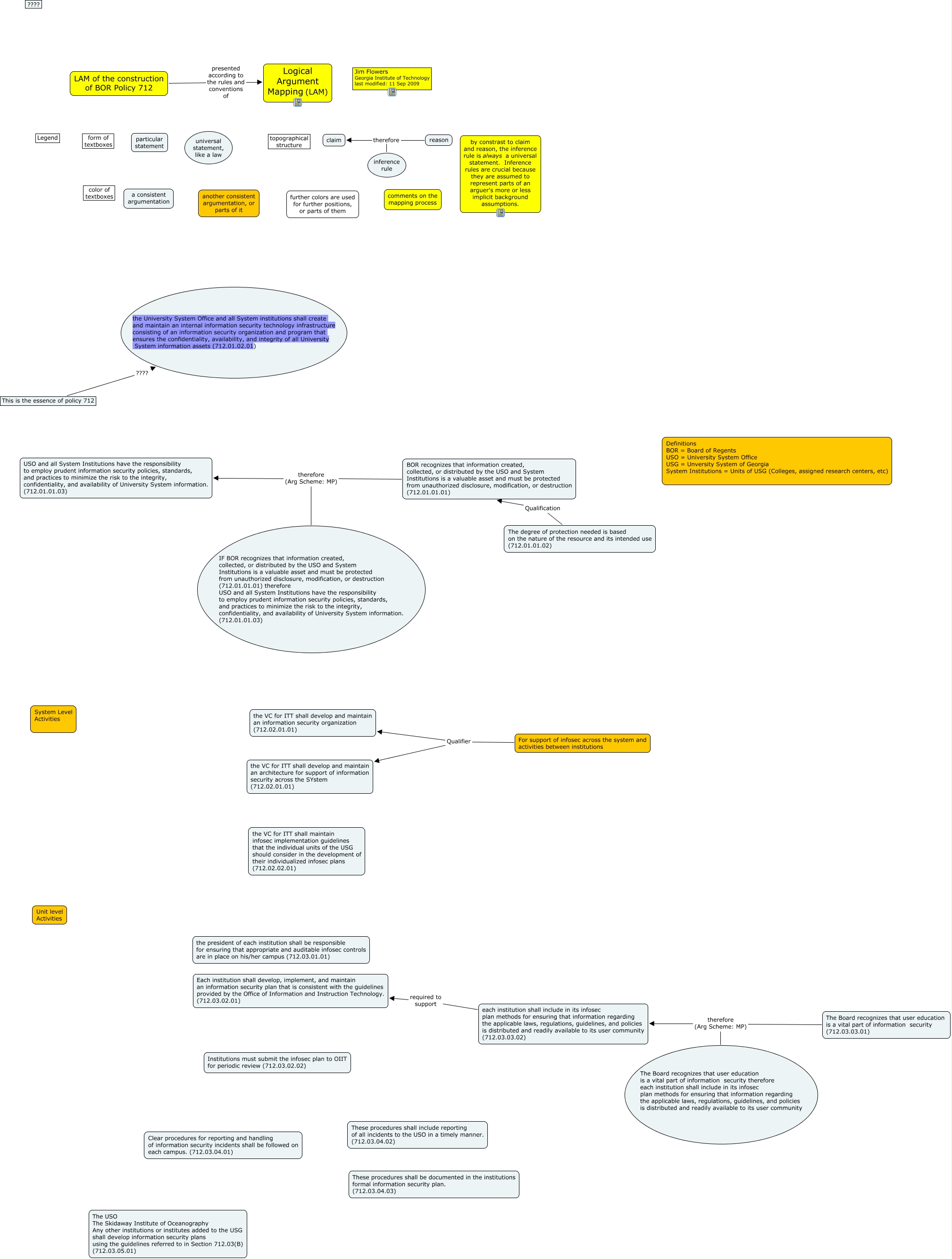 This Concept Map, created with IHMC CmapTools, has information related to: USG Information Security Policy (712), inference rule therefore claim, The Board recognizes that user education is a vital part of information security (712.03.03.01) therefore (Arg Scheme: MP) The Board recognizes that user education is a vital part of information security therefore each institution shall include in its infosec plan methods for ensuring that information regarding the applicable laws, regulations, guidelines, and policies is distributed and readily available to its user community, each institution shall include in its infosec plan methods for ensuring that information regarding the applicable laws, regulations, guidelines, and policies is distributed and readily available to its user community (712.03.03.02) required to support Each institution shall develop, implement, and maintain an information security plan that is consistent with the guidelines provided by the Office of Information and Instruction Technology. (712.03.02.01), reason therefore claim, LAM of the construction of BOR Policy 712 presented according to the rules and conventions of Logical Argument Mapping (LAM), The Board recognizes that user education is a vital part of information security (712.03.03.01) therefore (Arg Scheme: MP) each institution shall include in its infosec plan methods for ensuring that information regarding the applicable laws, regulations, guidelines, and policies is distributed and readily available to its user community (712.03.03.02), For support of infosec across the system and activities between institutions Qualifier the VC for ITT shall develop and maintain an architecture for support of information security across the SYstem (712.02.01.01), The degree of protection needed is based on the nature of the resource and its intended use (712.01.01.02) Qualification BOR recognizes that information created, collected, or distributed by the USO and System Institutions is a valuable asset and must be protected from unauthorized disclosure, modification, or destruction (712.01.01.01), For support of infosec across the system and activities between institutions Qualifier the VC for ITT shall develop and maintain an information security organization (712.02.01.01), BOR recognizes that information created, collected, or distributed by the USO and System Institutions is a valuable asset and must be protected from unauthorized disclosure, modification, or destruction (712.01.01.01) therefore (Arg Scheme: MP) USO and all System Institutions have the responsibility to employ prudent information security policies, standards, and practices to minimize the risk to the integrity, confidentiality, and availability of University System information. (712.01.01.03), This is the essence of policy 712 ???? the University System Office and all System institutions shall create and maintain an internal information security technology infrastructure consisting of an information security organization and program that ensures the confidentiality, availability, and integrity of all University System information assets (712.01.02.01), BOR recognizes that information created, collected, or distributed by the USO and System Institutions is a valuable asset and must be protected from unauthorized disclosure, modification, or destruction (712.01.01.01) therefore (Arg Scheme: MP) IF BOR recognizes that information created, collected, or distributed by the USO and System Institutions is a valuable asset and must be protected from unauthorized disclosure, modification, or destruction (712.01.01.01) therefore USO and all System Institutions have the responsibility to employ prudent information security policies, standards, and practices to minimize the risk to the integrity, confidentiality, and availability of University System information. (712.01.01.03)