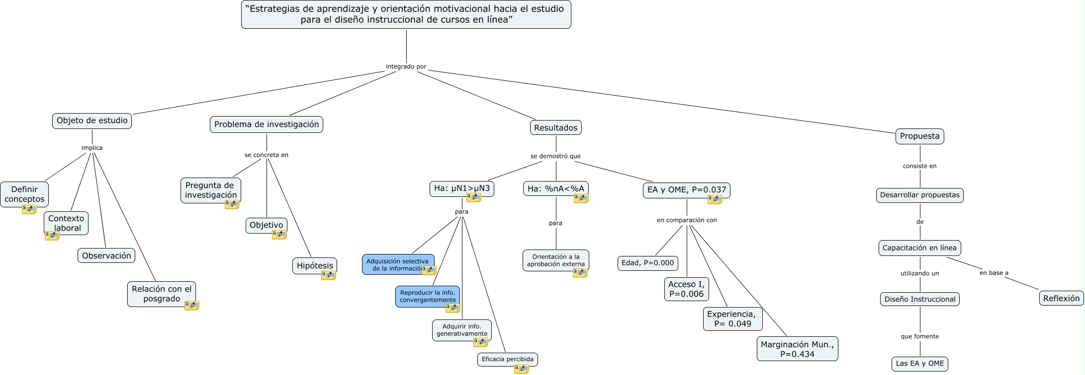 Este Cmap, tiene información relacionada con: Desarrollo Tesis, Objeto de estudio implica Observación, Propuesta consiste en Desarrollar propuestas, Ha: %nA<%A para Orientación a la aprobación externa, Diseño Instruccional que fomente Las EA y OME, Resultados se demostró que Ha: µN1>µN3, EA y OME, P=0.037 en comparación con Marginación Mun., P=0.434, Problema de investigación se concreta en Objetivo, Ha: µN1>µN3 para Reproducir la info. convergentemente, EA y OME, P=0.037 en comparación con Experiencia, P= 0.049, Problema de investigación se concreta en Hipótesis, Resultados se demostró que EA y OME, P=0.037, Objeto de estudio implica Contexto laboral, Resultados se demostró que Ha: %nA<%A, Ha: µN1>µN3 para Adquisición selectiva de la información, EA y OME, P=0.037 en comparación con Edad, P=0.000, EA y OME, P=0.037 en comparación con Acceso I, P=0.006, “Estrategias de aprendizaje y orientación motivacional hacia el estudio para el diseño instruccional de cursos en línea” integrado por Resultados, Problema de investigación se concreta en Pregunta de investigación, “Estrategias de aprendizaje y orientación motivacional hacia el estudio para el diseño instruccional de cursos en línea” integrado por Propuesta, Desarrollar propuestas de Capacitación en línea