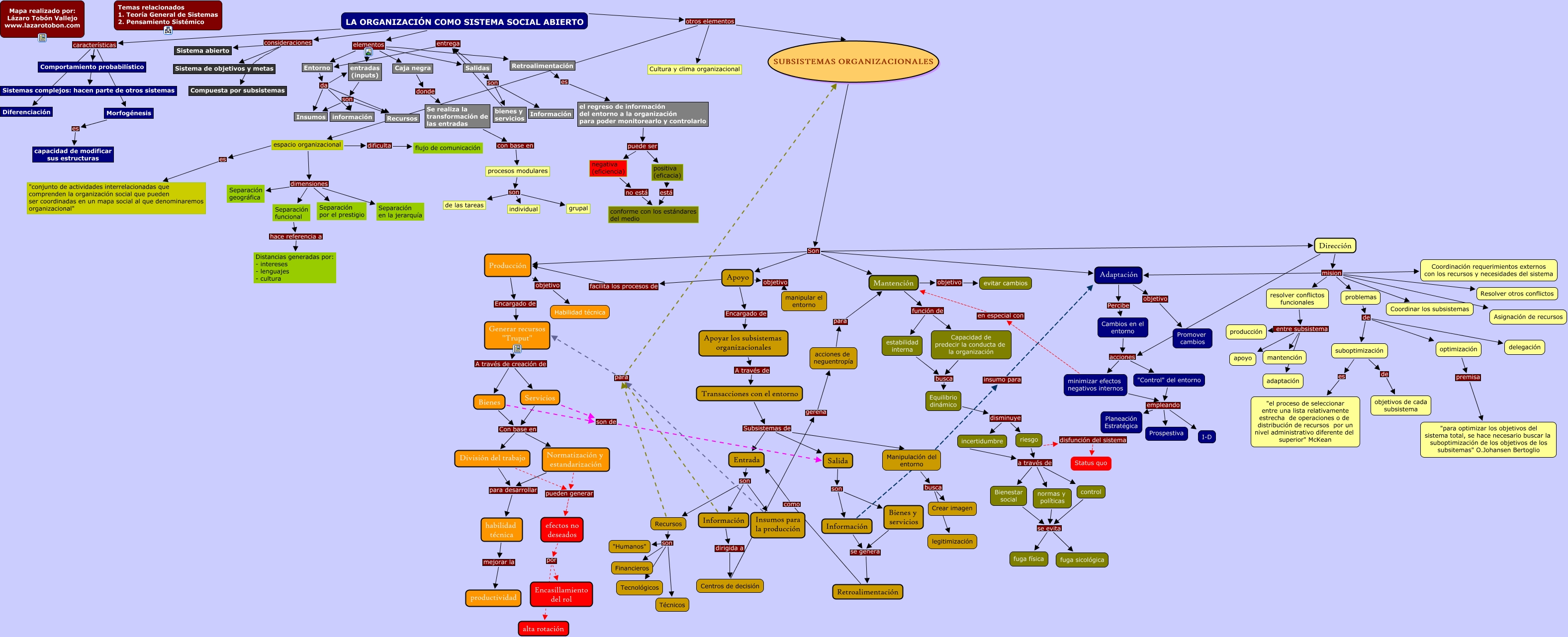 Este Cmap, tiene información relacionada con: Subsistemas organizacionaes, Recursos son Tecnológicos, Bienes y servicios se genera Retroalimentación, minimizar efectos negativos internos en especial con Mantención, Se realiza la transformación de las entradas con base en procesos modulares, resolver conflictos funcionales entre subsistema apoyo, Entrada son Información, el regreso de información del entorno a la organización para poder monitorearlo y controlarlo puede ser negativa (eficiencia), entradas (inputs) son información, riesgo a través de normas y políticas, Apoyo facilita los procesos de Producción, LA ORGANIZACIÓN COMO SISTEMA SOCIAL ABIERTO otros elementos SUBSISTEMAS ORGANIZACIONALES, SUBSISTEMAS ORGANIZACIONALES Son Mantención, Entorno da Insumos, Equilibrio dinámico disminuye riesgo, Dirección mision Coordinar los subsistemas, Adaptación objetivo Promover cambios, Generar recursos "Truput" A través de creación de Bienes, optimización premisa "para optimizar los objetivos del sistema total, se hace necesario buscar la suboptimización de los objetivos de los subsitemas" O.Johansen Bertoglio, Salidas son bienes y servicios, Separación funcional hace referencia a Distancias generadas por: - intereses - lenguajes - cultura