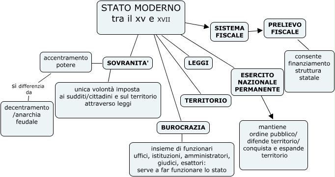 Questa Mappa Concettuale ha informazioni correlate a: Stato_moderno, PRELIEVO FISCALE ???? consente finanziamento struttura statale, accentramento potere si differenzia da decentramento /anarchia feudale, SOVRANITA' ???? unica volontà imposta ai sudditi/cittadini e sul territorio attraverso leggi, STATO MODERNO tra il xv e XVII ???? SISTEMA FISCALE, SOVRANITA' ???? accentramento potere, STATO MODERNO tra il xv e XVII ???? BUROCRAZIA, STATO MODERNO tra il xv e XVII ???? TERRITORIO, STATO MODERNO tra il xv e XVII ???? ESERCITO NAZIONALE PERMANENTE, SISTEMA FISCALE ???? PRELIEVO FISCALE, STATO MODERNO tra il xv e XVII ???? LEGGI