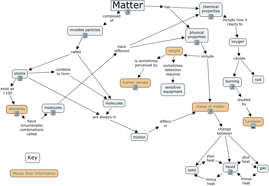 This Concept Map, created with IHMC CmapTools, has information related to: Chemical Properties and Change, physical properties include weight, invisible particles called molecules, solid plus heat liquid, molecules have different chemical properties, oxygen causes rust, invisible particles called atoms, states of matter change between gas, motion differs in states of matter, molecules are always in motion, Matter composed of invisible particles, molecules have different physical properties, chemical properties include how it reacts to oxygen, gas minus heat liquid, atoms are always in motion, elements have innumerable combinations called molecules, burning studied by Lavoisier, weight is sometimes perceived by human senses, physical properties include states of matter, states of matter change between solid, atoms exist as elements