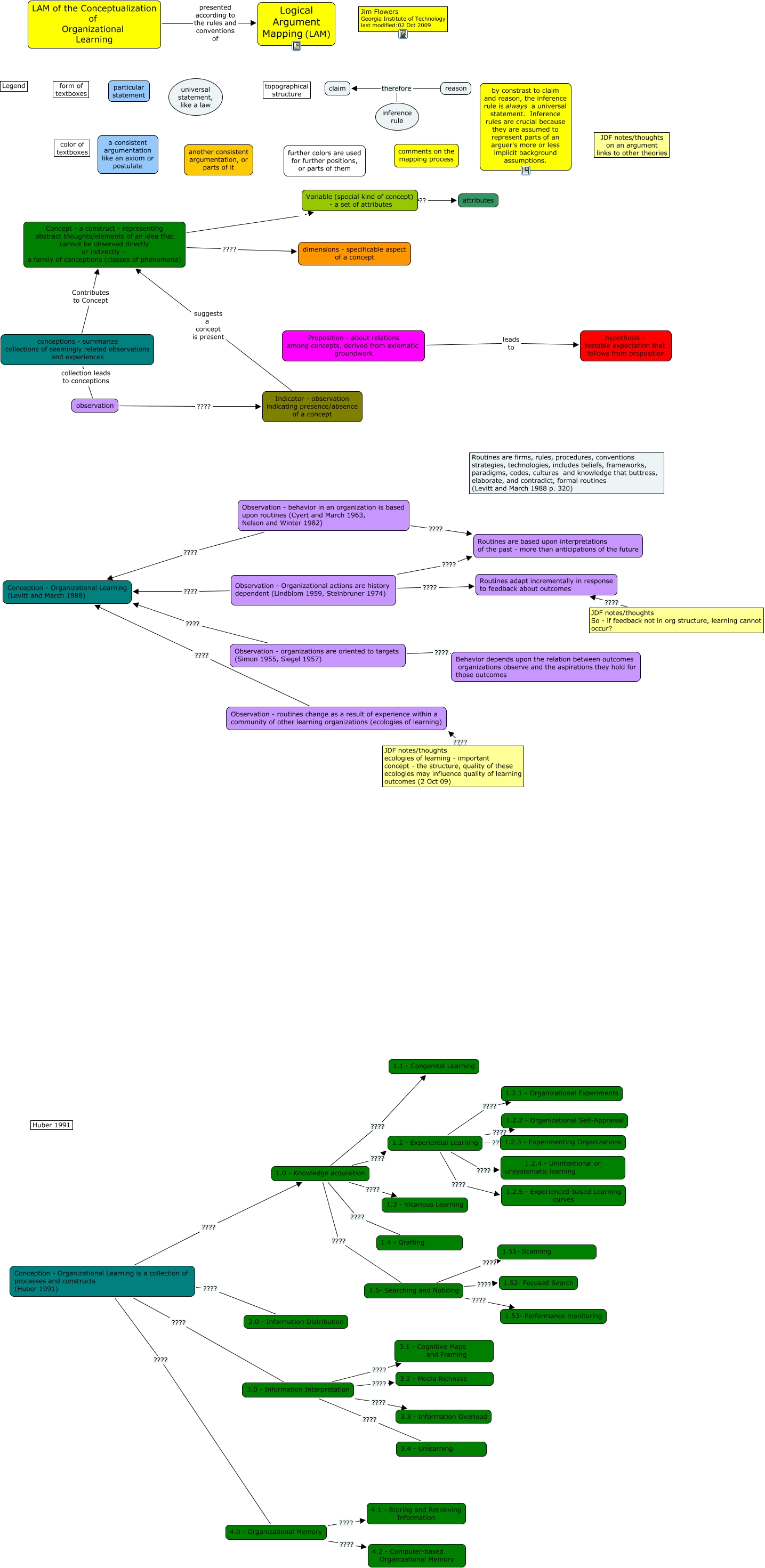 This Concept Map, created with IHMC CmapTools, has information related to: Conceptualizing Organizational learning, 1.5- Searching and Noticing ???? 1.51- Scanning, LAM of the Conceptualization of Organizational Learning presented according to the rules and conventions of Logical Argument Mapping (LAM), 1.0 - Knowledge acquisition ???? 1.1 - Congenital Learning, Observation - Organizational actions are history dependent (Lindblom 1959, Steinbruner 1974) ???? Conception - Organizational Learning (Levitt and March 1988), 4.0 - Organizational Memory ???? 4.2 - Computer-based Organizational Memory, observation collection leads to conceptions conceptions - summarize collections of seemingly related observations and experiences, Concept - a construct - representing abstract thoughts/elements of an idea that cannot be observed directly or indirectly - a family of conceptions (classes of phenomena) ???? dimensions - specificable aspect of a concept, 3.0 - Information Interpretation ???? 3.2 - Media Richness, Observation - organizations are oriented to targets (Simon 1955, Siegel 1957) ???? Behavior depends upon the relation between outcomes organizations observe and the aspirations they hold for those outcomes, inference rule therefore claim, Observation - routines change as a result of experience within a community of other learning organizations (ecologies of learning) ???? Conception - Organizational Learning (Levitt and March 1988), Conception - Organizational Learning is a collection of processes and constructs (Huber 1991) ???? 4.0 - Organizational Memory, 1.2 - Experiential Learning ???? 1.2.5 - Experienced-based Learning curves, JDF notes/thoughts So - if feedback not in org structure, learning cannot occur? ???? Routines adapt incrementally in response to feedback about outcomes, Proposition - about relations among concepts, derived from axiomatic groundwork leads to hypothesis - testable expectation that follows from proposition, Observation - Organizational actions are history dependent (Lindblom 1959, Steinbruner 1974) ???? Routines adapt incrementally in response to feedback about outcomes, 1.0 - Knowledge acquisition ???? 1.4 - Grafting, Observation - behavior in an organization is based upon routines (Cyert and March 1963, Nelson and Winter 1982) ???? Conception - Organizational Learning (Levitt and March 1988), 1.0 - Knowledge acquisition ???? 1.3 - Vicarious Learning, conceptions - summarize collections of seemingly related observations and experiences Contributes to Concept Concept - a construct - representing abstract thoughts/elements of an idea that cannot be observed directly or indirectly - a family of conceptions (classes of phenomena)