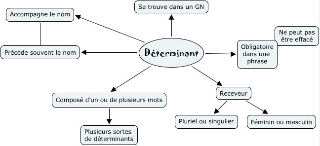 Cette carte conceptuelle, cree avec IHMC CmapTools, contient des informations liees a : Déterminants, Receveur Pluriel ou singulier, Composé d'un ou de plusieurs mots Plusieurs sortes de déterminants, Accompagne le nom Précède souvent le nom, Déterminant Obligatoire dans une phrase, Déterminant Accompagne le nom, Déterminant Se trouve dans un GN, Receveur Féminin ou masculin, Déterminant Précède souvent le nom, Déterminant Receveur, Déterminant Composé d'un ou de plusieurs mots
