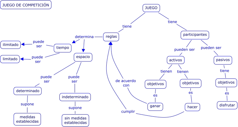Este Cmap, tiene información relacionada con: JUEGO, objetivos es hacer, tiempo puede ser ilimitado, pasivos tiene objetivos, activos tienen objetivos, determinado supone medidas establecidas, JUEGO tiene reglas, participantes pueden ser activos, reglas determina espacio, objetivos es disfrutar, objetivos es ganar, JUEGO tiene participantes, indeterminado supone sin medidas establecidas, reglas determina tiempo, hacer cumplir reglas, espacio puede ser indeterminado, ganar de acuerdo con reglas, participantes pueden ser pasivos, activos tienen objetivos, tiempo puede ser limitado, espacio puede ser determinado