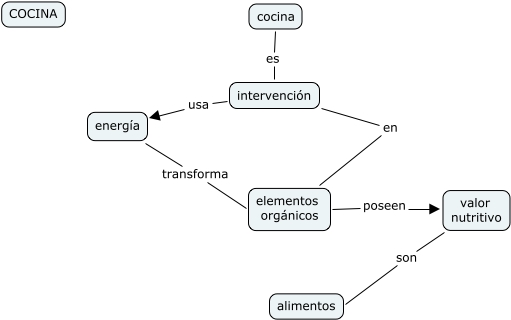 Este Cmap, tiene información relacionada con: cocina, cocina es intervención, intervención en elementos orgánicos, energía transforma elementos orgánicos, intervención usa energía, elementos orgánicos poseen valor nutritivo, valor nutritivo son alimentos