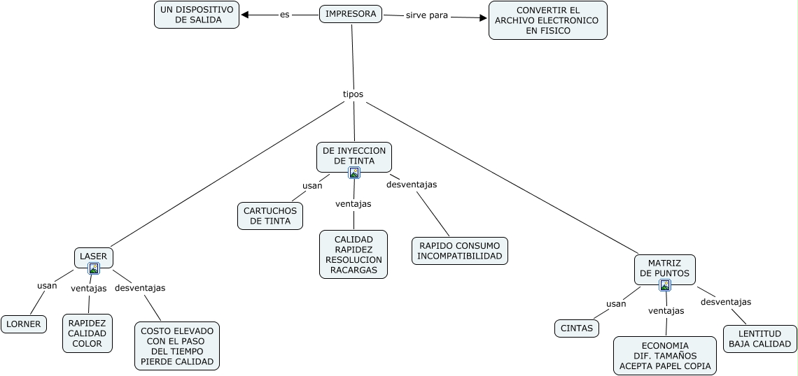 Este Cmap, tiene información relacionada con: IMPRESORA, DE INYECCION DE TINTA ventajas CALIDAD RAPIDEZ RESOLUCION RACARGAS, LASER ventajas RAPIDEZ CALIDAD COLOR, LASER usan LORNER, DE INYECCION DE TINTA desventajas RAPIDO CONSUMO INCOMPATIBILIDAD, LASER desventajas COSTO ELEVADO CON EL PASO DEL TIEMPO PIERDE CALIDAD, IMPRESORA es UN DISPOSITIVO DE SALIDA, DE INYECCION DE TINTA usan CARTUCHOS DE TINTA, IMPRESORA tipos MATRIZ DE PUNTOS, MATRIZ DE PUNTOS ventajas ECONOMIA DIF. TAMAÑOS ACEPTA PAPEL COPIA, MATRIZ DE PUNTOS usan CINTAS, IMPRESORA sirve para CONVERTIR EL ARCHIVO ELECTRONICO EN FISICO, IMPRESORA tipos DE INYECCION DE TINTA, MATRIZ DE PUNTOS desventajas LENTITUD BAJA CALIDAD, IMPRESORA tipos LASER