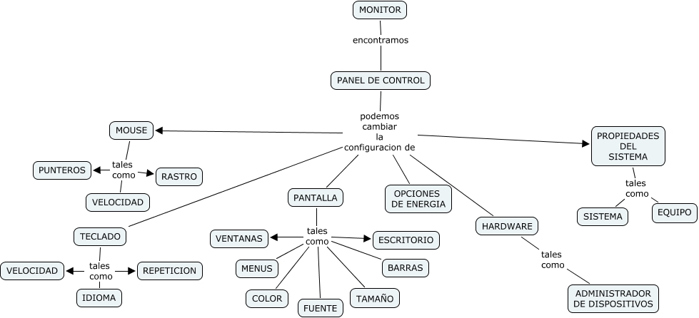 Este Cmap, tiene información relacionada con: MONITOR, PANEL DE CONTROL podemos cambiar la configuracion de OPCIONES DE ENERGIA, TECLADO tales como REPETICION, MOUSE tales como VELOCIDAD, PANTALLA tales como VENTANAS, MOUSE tales como RASTRO, PROPIEDADES DEL SISTEMA tales como SISTEMA, PANTALLA tales como MENUS, MOUSE tales como PUNTEROS, TECLADO tales como VELOCIDAD, PANEL DE CONTROL podemos cambiar la configuracion de PANTALLA, TECLADO tales como IDIOMA, PANEL DE CONTROL podemos cambiar la configuracion de HARDWARE, PANTALLA tales como FUENTE, MONITOR encontramos PANEL DE CONTROL, PANTALLA tales como ESCRITORIO, PANTALLA tales como COLOR, HARDWARE tales como ADMINISTRADOR DE DISPOSITIVOS, PANEL DE CONTROL podemos cambiar la configuracion de TECLADO, PANTALLA tales como TAMAÑO, PROPIEDADES DEL SISTEMA tales como EQUIPO