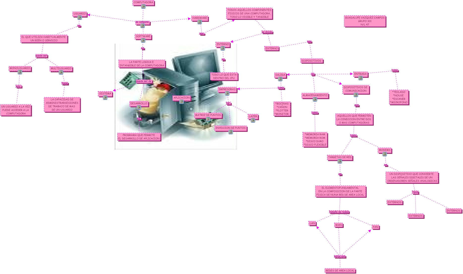 Este Cmap, tiene información relacionada con: MAPA DE MAYEYA, EL QUE UTILIZA HABITUALMENTE UN BIEN O SERVICIO puede ser MONOUSUARIO, ALMACENAMIENTO como *MEMORIA RAM *MEMORIA ROM *DISCO DURO *DISCO FLEXIBLE, INTERNO es TODO LO QUE ESTA DENTRO DEL CPU, UN DISPOSITIVO QUE CONVIERTE LAS SEÑALES DIGITALES DE UN ORDENADOREN SEÑALES ANALOGICAS tipos EXTERNOS, TODOS AQUELLOS COMPONENTES FISICOS DE UNA COMPUTADORA, TODO LO VISIBLE Y TANGIBLE se divide INTERNO, MONOUSUARIO solo UN USUARIO A LA VEZ PUEDE ACCEDER A LA COMPUTADORA, IMPRESORAS DE MATRIZ DE PUNTOS, UN DISPOSITIVO QUE CONVIERTE LAS SEÑALES DIGITALES DE UN ORDENADOREN SEÑALES ANALOGICAS tipos EXTERNOS, SOFTWARE es LA PARTE LOGICA E INTANGIBLE DE LA COMPUTADORA, LA PARTE LOGICA E INTANGIBLE DE LA COMPUTADORA puede ser de APLICACION, WAN estas son LAN, EL QUE UTILIZA HABITUALMENTE UN BIEN O SERVICIO puede ser MULTIUSUARIO, AQUELLOS QUE PERMITEN LA CONECCION ENTRE DOS O MAS COMPUTADORAS como MODEMS, SALIDA como IMPRESORAS, DISPOSITIVOS de ENTRADA, SALIDA como *BOCINAS *CAÑON *PLOTTER *MONITOR, EL ELEMENTOFUNDAMENTAL EN LA COMPOSICION DE LA PARTE FISICA DE NUNA RED DE AREA LOCAL tamaño de redes LAN, COMPUTADORA se compone HARDWARE, WAN estas son PAN, MODEMS es UN DISPOSITIVO QUE CONVIERTE LAS SEÑALES DIGITALES DE UN ORDENADOREN SEÑALES ANALOGICAS