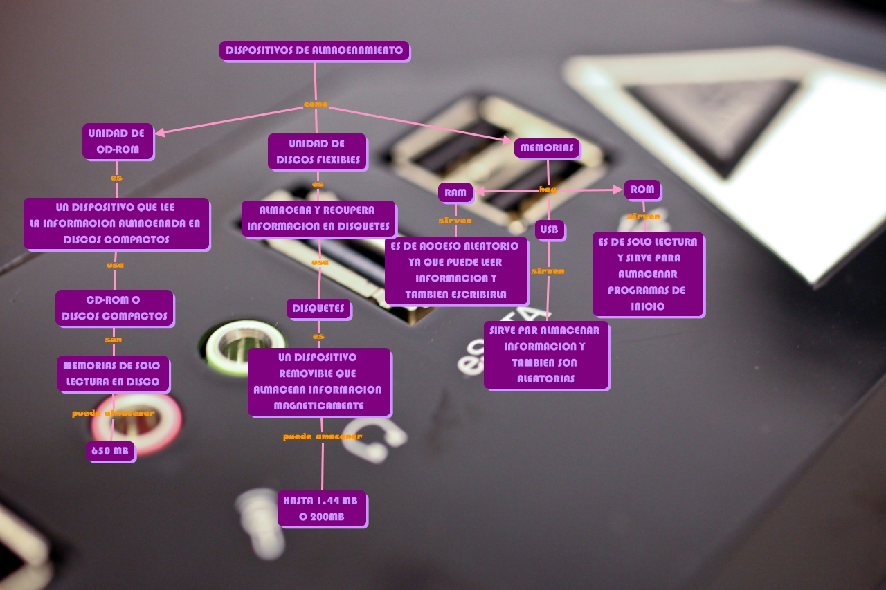 Este Cmap, tiene información relacionada con: ALAMACENAMIENTO, DISQUETES es UN DISPOSITIVO REMOVIBLE QUE ALMACENA INFORMACION MAGNETICAMENTE, UN DISPOSITIVO QUE LEE LA INFORMACION ALMACENADA EN DISCOS COMPACTOS usa CD-ROM O DISCOS COMPACTOS, USB sirven SIRVE PAR ALMACENAR INFORMACION Y TAMBIEN SON ALEATORIAS, DISPOSITIVOS DE ALMACENAMIENTO como UNIDAD DE DISCOS FLEXIBLES, MEMORIAS hay USB, UNIDAD DE CD-ROM es UN DISPOSITIVO QUE LEE LA INFORMACION ALMACENADA EN DISCOS COMPACTOS, ROM sirven ES DE SOLO LECTURA Y SIRVE PARA ALMACENAR PROGRAMAS DE INICIO, MEMORIAS hay ROM, DISPOSITIVOS DE ALMACENAMIENTO como UNIDAD DE CD-ROM, MEMORIAS DE SOLO LECTURA EN DISCO puede almacenar 650 MB, UN DISPOSITIVO REMOVIBLE QUE ALMACENA INFORMACION MAGNETICAMENTE puede amacenar HASTA 1.44 MB O 200MB, UNIDAD DE DISCOS FLEXIBLES es ALMACENA Y RECUPERA INFORMACION EN DISQUETES, ALMACENA Y RECUPERA INFORMACION EN DISQUETES usa DISQUETES, MEMORIAS hay RAM, RAM sirven ES DE ACCESO ALEATORIO YA QUE PUEDE LEER INFORMACION Y TAMBIEN ESCRIBIRLA, CD-ROM O DISCOS COMPACTOS son MEMORIAS DE SOLO LECTURA EN DISCO, DISPOSITIVOS DE ALMACENAMIENTO como MEMORIAS