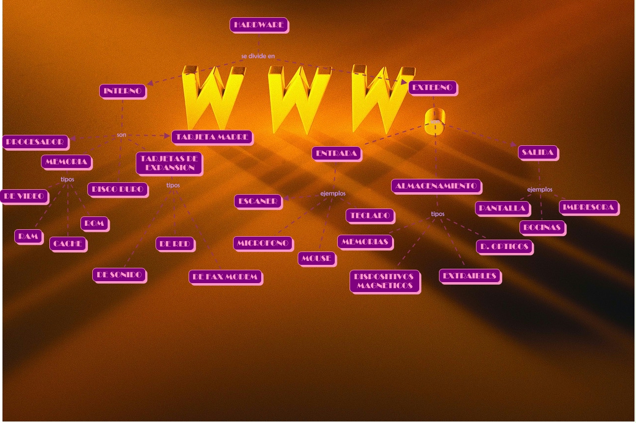 Este Cmap, tiene información relacionada con: hardawad, INTERNO son TARJETAS DE EXPANSION, TARJETAS DE EXPANSION tipos DE RED, MEMORIA tipos DE VIDEO, INTERNO son MEMORIA, INTERNO son TARJETA MADRE, HARDWARE se divide en INTERNO, TARJETAS DE EXPANSION tipos DE SONIDO, MEMORIA tipos CACHE, ENTRADA ejemplos MOUSE, ENTRADA ejemplos TECLADO, INTERNO son PROCESADOR, EXTERNO son ALMACENAMIENTO, SALIDA ejemplos PANTALLA, INTERNO son DISCO DURO, SALIDA ejemplos BOCINAS, ALMACENAMIENTO tipos DISPOSITIVOS MAGNETICOS, ALMACENAMIENTO tipos EXTRAIBLES, TARJETAS DE EXPANSION tipos DE FAX MODEM, ALMACENAMIENTO tipos MEMORIAS, MEMORIA tipos RAM