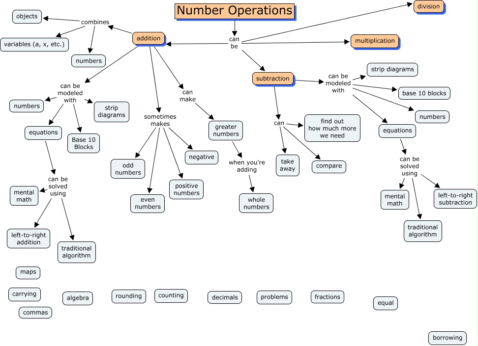 This Concept Map, created with IHMC CmapTools, has information related to: Number Operations, Number Operations can be division, addition sometimes makes odd numbers, greater numbers when you're adding whole numbers, addition sometimes makes even numbers, equations can be solved using left-to-right subtraction, addition sometimes makes positive numbers, subtraction can compare, subtraction can be modeled with equations, addition can be modeled with Base 10 Blocks, equations can be solved using left-to-right addition, equations can be solved using traditional algorithm, subtraction can be modeled with strip diagrams, subtraction can be modeled with numbers, addition can make greater numbers, Number Operations can be addition, Number Operations can be subtraction, equations can be solved using mental math, addition can be modeled with equations, subtraction can take away, subtraction can find out how much more we need