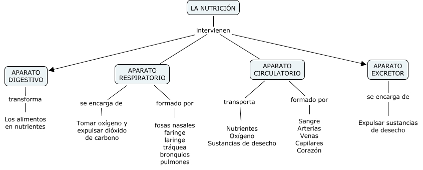 Este mapa conceptual tiene información relacionada a: LA NUTRICIÓN.Zoe y Daniela, APARATO EXCRETOR se encarga de Expulsar sustancias de desecho, APARATO CIRCULATORIO transporta Nutrientes Oxígeno Sustancias de desecho, LA NUTRICIÓN intervienen APARATO DIGESTIVO, APARATO RESPIRATORIO se encarga de Tomar oxígeno y expulsar dióxido de carbono, APARATO CIRCULATORIO formado por Sangre Arterias Venas Capilares Corazón, APARATO RESPIRATORIO formado por fosas nasales faringe laringe tráquea bronquios pulmones, LA NUTRICIÓN intervienen APARATO CIRCULATORIO, APARATO DIGESTIVO transforma Los alimentos en nutrientes, LA NUTRICIÓN intervienen APARATO EXCRETOR, LA NUTRICIÓN intervienen APARATO RESPIRATORIO