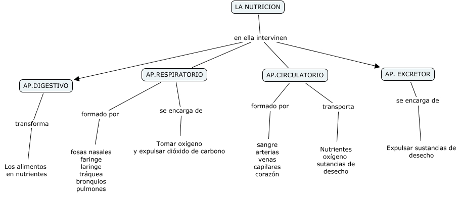 Este mapa conceptual tiene información relacionada a: LA NUTRICIÓN.Angel y Sofia, AP. EXCRETOR se encarga de Expulsar sustancias de desecho, AP.DIGESTIVO transforma Los alimentos en nutrientes, AP.CIRCULATORIO formado por sangre arterias venas capilares corazón, AP.RESPIRATORIO se encarga de Tomar oxígeno y expulsar dióxido de carbono, LA NUTRICION en ella intervinen AP.RESPIRATORIO, AP.CIRCULATORIO transporta Nutrientes oxígeno sutancias de desecho, LA NUTRICION en ella intervinen AP.DIGESTIVO, LA NUTRICION en ella intervinen AP. EXCRETOR, AP.RESPIRATORIO formado por fosas nasales faringe laringe tráquea bronquios pulmones, LA NUTRICION en ella intervinen AP.CIRCULATORIO