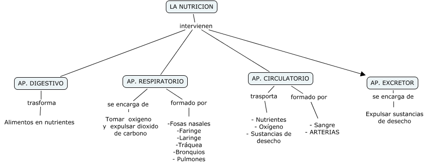 Este Cmap, tiene información relacionada con: LA NUTRICIÓN.Andrea y Mabel, AP. RESPIRATORIO se encarga de Tomar oxigeno y expulsar dioxido de carbono, LA NUTRICION intervienen AP. EXCRETOR, AP. CIRCULATORIO trasporta - Nutrientes - Oxígeno - Sustancias de desecho, AP. RESPIRATORIO formado por -Fosas nasales -Faringe -Laringe -Tráquea -Bronquios - Pulmones, AP. EXCRETOR se encarga de Expulsar sustancias de desecho, AP. DIGESTIVO trasforma Alimentos en nutrientes, LA NUTRICION intervienen AP. RESPIRATORIO, AP. CIRCULATORIO formado por - Sangre - ARTERIAS, LA NUTRICION intervienen AP. CIRCULATORIO, LA NUTRICION intervienen AP. DIGESTIVO