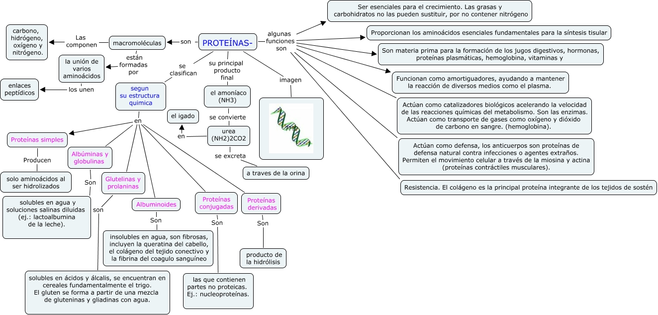 Este Cmap, tiene información relacionada con: PROTEÍNAS -2, Proteínas derivadas Son producto de la hidrólisis, Albúminas y globulinas Son solubles en agua y soluciones salinas diluidas (ej.: lactoalbumina de la leche)., PROTEÍNAS- su principal producto final el amoníaco (NH3), PROTEÍNAS- algunas funciones son Ser esenciales para el crecimiento. Las grasas y carbohidratos no las pueden sustituir, por no contener nitrógeno, Albuminoides Son insolubles en agua, son fibrosas, incluyen la queratina del cabello, el colágeno del tejido conectivo y la fibrina del coagulo sanguíneo, segun su estructura quimica en Proteínas conjugadas, Proteínas simples Producen solo aminoácidos al ser hidrolizados, segun su estructura quimica en Albúminas y globulinas, PROTEÍNAS- se clasifican segun su estructura quimica, PROTEÍNAS- algunas funciones son Resistencia. El colágeno es la principal proteína integrante de los tejidos de sostén, segun su estructura quimica en Albuminoides, PROTEÍNAS- algunas funciones son Son materia prima para la formación de los jugos digestivos, hormonas, proteínas plasmáticas, hemoglobina, vitaminas y, Glutelinas y prolaninas son solubles en ácidos y álcalis, se encuentran en cereales fundamentalmente el trigo. El gluten se forma a partir de una mezcla de gluteninas y gliadinas con agua., el amoníaco (NH3) se convierte urea (NH2)2CO2, Proteínas conjugadas Son las que contienen partes no proteicas. Ej.: nucleoproteínas., segun su estructura quimica en Proteínas simples, macromoléculas Las componen carbono, hidrógeno, oxígeno y nitrógeno., PROTEÍNAS- algunas funciones son Actúan como catalizadores biológicos acelerando la velocidad de las reacciones químicas del metabolismo. Son las enzimas. Actúan como transporte de gases como oxígeno y dióxido de carbono en sangre. (hemoglobina)., urea (NH2)2CO2 en el igado, PROTEÍNAS- son macromoléculas