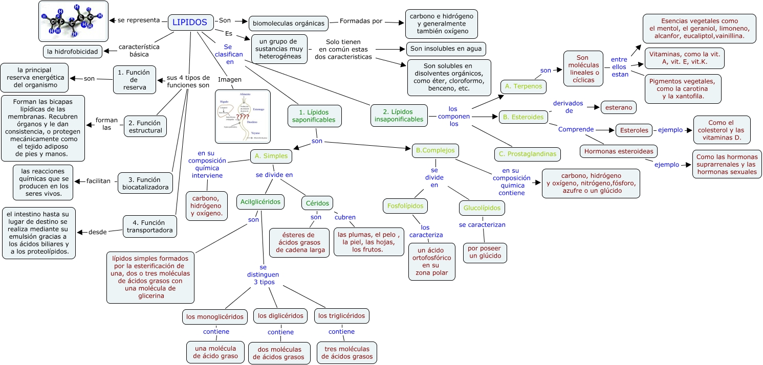 Este Cmap, tiene información relacionada con: LIPIDOS 2, biomoleculas orgánicas Formadas por carbono e hidrógeno y generalmente también oxígeno, 2. Lípidos insaponificables los componen los C. Prostaglandinas, LIPIDOS se representa, B. Esteroides Comprende Hormonas esteroideas, B. Esteroides derivados de esterano, LIPIDOS sus 4 tipos de funciones son 3. Función biocatalizadora, Son moléculas lineales o cíclicas entre ellos estan Esencias vegetales como el mentol, el geraniol, limoneno, alcanfor, eucaliptol,vainillina., Son moléculas lineales o cíclicas entre ellos estan Pigmentos vegetales, como la carotina y la xantofila., LIPIDOS sus 4 tipos de funciones son 4. Función transportadora, Céridos cubren las plumas, el pelo , la piel, las hojas, los frutos., 2. Lípidos insaponificables los componen los A. Terpenos, 2. Lípidos insaponificables los componen los B. Esteroides, LIPIDOS Se clasifican en 2. Lípidos insaponificables, B.Complejos se divide en Fosfolípidos, A. Simples en su composición química interviene carbono, hidrógeno y oxígeno., los monoglicéridos contiene una molécula de ácido graso, un grupo de sustancias muy heterogéneas Solo tienen en común estas dos caracteristicas Son solubles en disolventes orgánicos, como éter, cloroformo, benceno, etc., Acilglicéridos son lípidos simples formados por la esterificación de una, dos o tres moléculas de ácidos grasos con una molécula de glicerina, Hormonas esteroideas ejemplo Como las hormonas suprarrenales y las hormonas sexuales, Fosfolípidos los caracteriza un ácido ortofosfórico en su zona polar