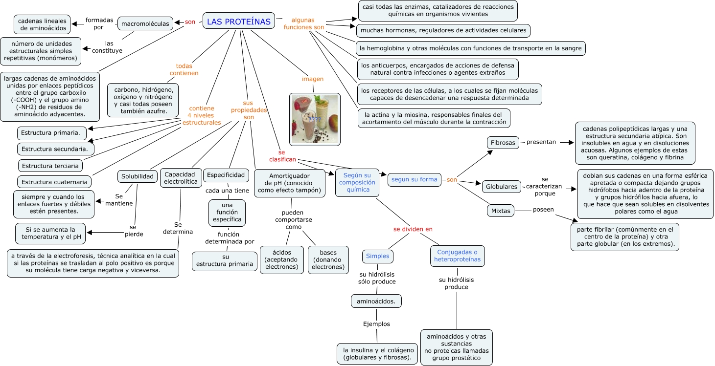 Este Cmap, tiene información relacionada con: PROTEÍNAS, LAS PROTEÍNAS sus propiedades son Especificidad, LAS PROTEÍNAS contiene 4 niveles estructurales Estructura cuaternaria, Globulares se caracterizan porque doblan sus cadenas en una forma esférica apretada o compacta dejando grupos hidrófobos hacia adentro de la proteína y grupos hidrófilos hacia afuera, lo que hace que sean solubles en disolventes polares como el agua, Amortiguador de pH (conocido como efecto tampón) pueden comportarse como ácidos (aceptando electrones), Conjugadas o heteroproteínas su hidrólisis produce aminoácidos y otras sustancias no proteicas llamadas grupo prostético, LAS PROTEÍNAS algunas funciones son casi todas las enzimas, catalizadores de reacciones químicas en organismos vivientes, segun su forma son Globulares, LAS PROTEÍNAS sus propiedades son Solubilidad, aminoácidos. Ejemplos la insulina y el colágeno (globulares y fibrosas)., LAS PROTEÍNAS algunas funciones son muchas hormonas, reguladores de actividades celulares, Fibrosas presentan cadenas polipeptídicas largas y una estructura secundaria atípica. Son insolubles en agua y en disoluciones acuosas. Algunos ejemplos de estas son queratina, colágeno y fibrina, macromoléculas las constituye número de unidades estructurales simples repetitivas (monómeros), Especificidad cada una tiene una función específica, LAS PROTEÍNAS imagen ????, Amortiguador de pH (conocido como efecto tampón) pueden comportarse como bases (donando electrones), Solubilidad Se mantiene siempre y cuando los enlaces fuertes y débiles estén presentes., LAS PROTEÍNAS contiene 4 niveles estructurales Estructura secundaria., Según su composición química se dividen en Conjugadas o heteroproteínas, segun su forma son Fibrosas, macromoléculas formadas por cadenas lineales de aminoácidos