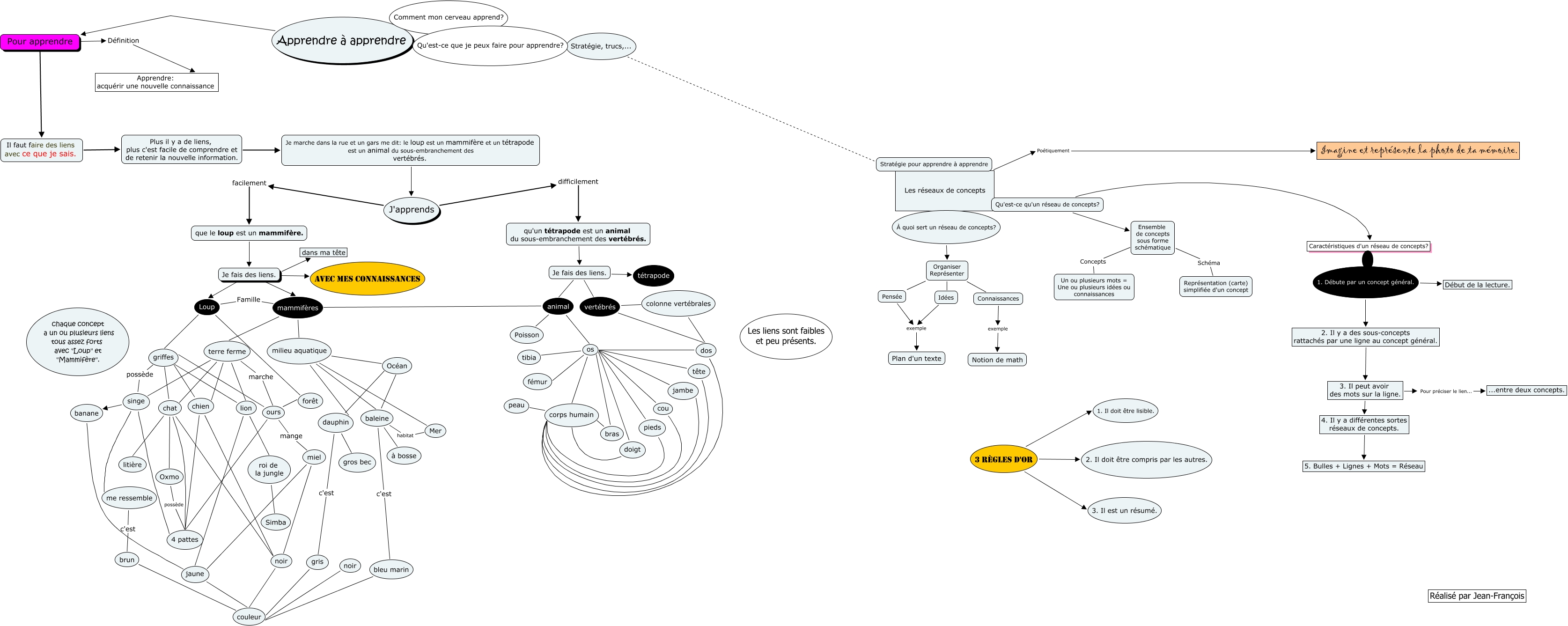 Cette carte conceptuelle, cree avec IHMC CmapTools, contient des informations liees a : Apprendre à apprendre_JF, 2. Il y a des sous-concepts rattachés par une ligne au concept général. 3. Il peut avoir des mots sur la ligne., dauphin Océan, singe me ressemble, jambe corps humain, Pour apprendre Il faut faire des liens avec ce que je sais., 1. Débute par un concept général. Début de la lecture., chat Oxmo, 3 règles d'or 1. Il doit être lisible., Il faut faire des liens avec ce que je sais. Plus il y a de liens, plus c'est facile de comprendre et de retenir la nouvelle information., noir couleur, doigt corps humain, Organiser Représenter Idées, chat griffes, milieu aquatique dauphin, Plus il y a de liens, plus c'est facile de comprendre et de retenir la nouvelle information. Je marche dans la rue et un gars me dit: le loup est un mammifère et un tétrapode est un animal du sous-embranchement des vertébrés., 3. Il peut avoir des mots sur la ligne. 4. Il y a différentes sortes réseaux de concepts., chien 4 pattes, qu'un tétrapode est un animal du sous-embranchement des vertébrés. Je fais des liens., À quoi sert un réseau de concepts? Organiser Représenter, ours forêt