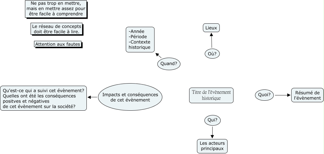 Cette carte conceptuelle, cree avec IHMC CmapTools, contient des informations liees a : Évènement historique, Qui? Les acteurs principaux, Quoi? Résumé de l'évènement, Quand? -Année -Période -Contexte historique, Impacts et conséquences de cet évènement Qu'est-ce qui a suivi cet évènement? Quelles ont été les conséquences positves et négatives de cet évènement sur la société?, Où? Lieux