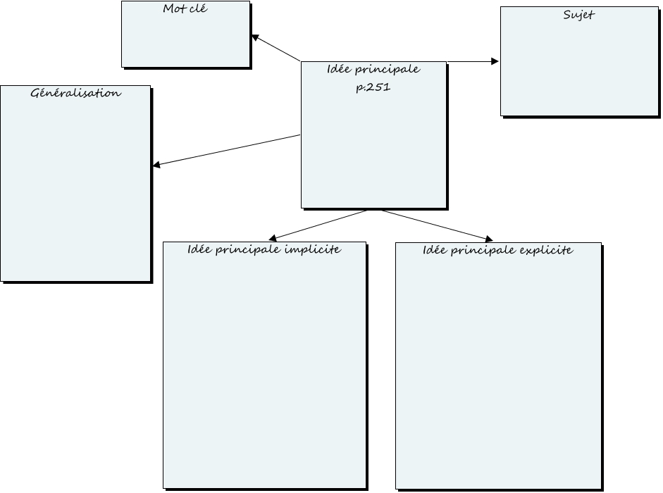 Cette carte conceptuelle, cree avec IHMC CmapTools, contient des informations liees a : Idée principale, Idée principale p.251 Idée principale explicite, Idée principale p.251 Mot clé, Idée principale p.251 Idée principale implicite, Idée principale p.251 Sujet, Idée principale p.251 Généralisation