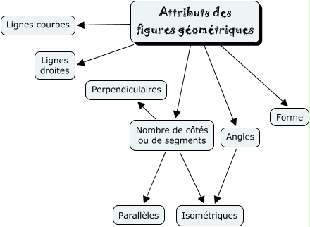 Cette carte conceptuelle, cree avec IHMC CmapTools, contient des informations liees a : Attributs des figures géo, Nombre de côtés ou de segments Perpendiculaires, Attributs des figures géométriques Nombre de côtés ou de segments, Attributs des figures géométriques Lignes courbes, Attributs des figures géométriques Lignes droites, Attributs des figures géométriques Forme, Nombre de côtés ou de segments Isométriques, Attributs des figures géométriques Angles, Nombre de côtés ou de segments Parallèles, Angles Isométriques