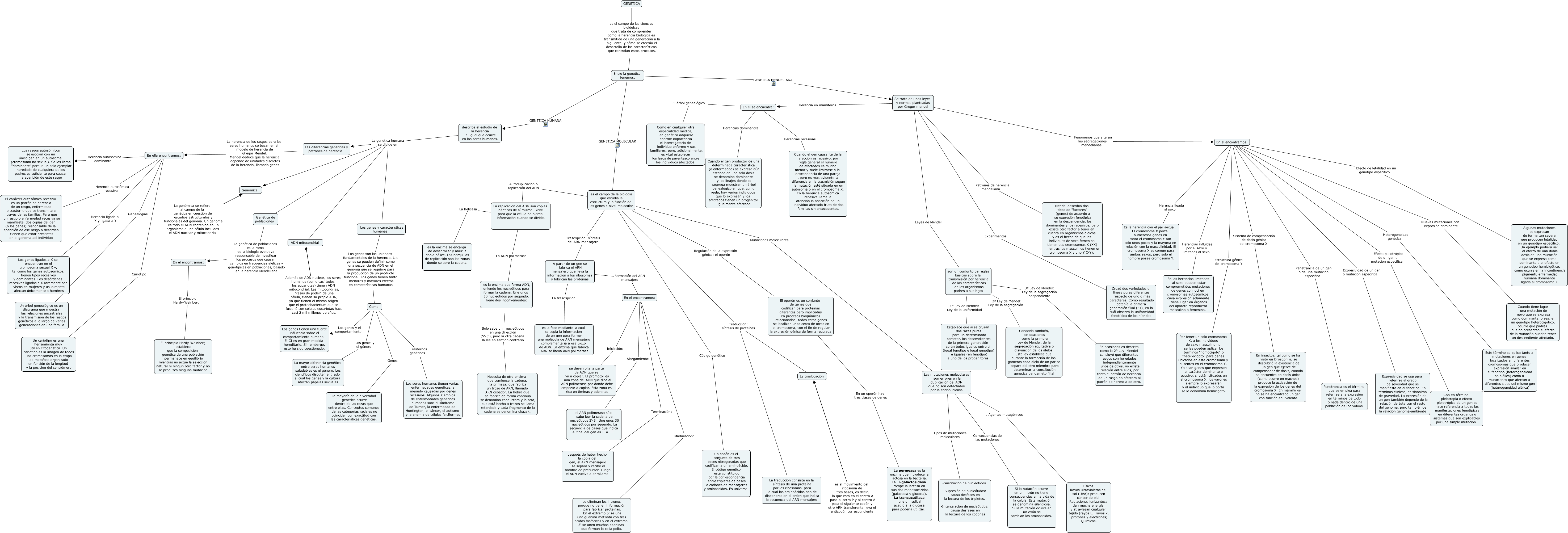 Este Cmap, tiene información relacionada con: RECUPERACION 1 PERIODO BRILLY ESTRADA, Entre la genetica tenemos: GENETICA HUMANA describe el estudio de la herencia al igual que ocurre en los seres humanos., describe el estudio de la herencia al igual que ocurre en los seres humanos. La genetica humana se divide en: ADN mitocondrial, son un conjunto de reglas básicas sobre la transmisión por herencia de las características de los organismos padres a sus hijos 1ª Ley de Mendel: Ley de la uniformidad Establece que si se cruzan dos razas puras para un determinado carácter, los descendientes de la primera generación serán todos iguales entre sí (igual fenotipo e igual genotipo) e iguales (en fenotipo) a uno de los progenitores., En ella encontramos: Herencia autosómica recesiva El carácter autosómico recesivo es un patrón de herencia de un rasgo, enfermedad o trastorno que se transmite a través de las familias. Para que un rasgo o enfermedad recesiva se manifieste, dos copias del gen (o los genes) responsable de la aparición de ese rasgo o desorden tienen que estar presentes en el genoma del individuo, describe el estudio de la herencia al igual que ocurre en los seres humanos. La genetica humana se divide en: Genética de poblaciones, es el campo de la biología que estudia la estructura y la función de los genes a nivel molecular Autoduplicación o replicación del ADN La replicación del ADN son copias idénticas de sí mismo. Sirve para que la célula no pierda información cuando se divide., En el encontramos: Nuevas mutaciones con expresión dominante Cuando tiene lugar una mutación de novo que se expresa como dominante, o sea, en un genotipo heterocigótico, ocurre que padres que no presentan el efecto de la mutación pueden tener un descendiente afectado., En el encontramos: Herencias influidas por el sexo y limitadas al sexo En las herencias limitadas al sexo pueden estar comprometidos mutaciones de genes con loci en cromosomas autosómicos cuya expresión solamente tiene lugar en órganos del aparato reproductor masculino o femenino., La replicación del ADN son copias idénticas de sí mismo. Sirve para que la célula no pierda información cuando se divide. La ADN polimerasa es la enzima que forma ADN, uniendo los nucleótidos para formar la cadena. Une unos 50 nucleótidos por segundo. Tiene dos inconvenientes:, A partir de un gen se fabrica el ARN mensajero que lleva la información a los ribosomas y fabrican las proteínas Formación del ARN mensajero En el encontramos:, Se trata de unas leyes y normas planteadas por Gregor mendel Herencia en mamíferos En el se encuentra:, En el encontramos: Estructura génica del cromosoma Y Por tener un solo cromosoma X, a los individuos de sexo masculino no se les pueden aplicar los términos "homocigoto" o "heterocigoto" para genes ubicados en este cromosoma y ausentes en el cromosoma Y. Ya sean genes que expresen el carácter dominante o recesivo, si están situados en el cromosoma X, los varones siempre lo expresarán y al individuo que lo porta se le denomina hemicigoto., En el se encuentra: Herencias recesivas Cuando el gen causante de la afección es recesivo, por regla general el número de afectados es mucho menor y suele limitarse a la descendencia de una pareja , pero es más evidente la diferencia en la trasmisión según la mutación esté situada en un autosoma o en el cromosoma X. En la herencia autosómica recesiva llama la atención la aparición de un individuo afectado fruto de dos familias sin antecedentes., describe el estudio de la herencia al igual que ocurre en los seres humanos. La genetica humana se divide en: Los genes y características humanas, La replicación del ADN son copias idénticas de sí mismo. Sirve para que la célula no pierda información cuando se divide. La helicasa es la enzima se encarga de desenrollar y abrir la doble hélice. Las horquillas de replicación son las zonas donde se abre la cadena., Se trata de unas leyes y normas planteadas por Gregor mendel Experimentos Cruzó dos variedades o líneas puras diferentes respecto de uno o más caracteres. Como resultado obtenía la primera generación filial (F1), en la cuál observó la uniformidad fenotípica de los híbridos, Se trata de unas leyes y normas planteadas por Gregor mendel Patrones de herencia mendeliana Mendel describió dos tipos de "factores" (genes) de acuerdo a su expresión fenotípica en la descendencia, los dominantes y los recesivos, pero existe otro factor a tener en cuenta en organismos dioicos y es el hecho de que los individuos de sexo femenino tienen dos cromosomas X (XX) mientras los masculinos tienen un cromosoma X y uno Y (XY),, es el campo de la biología que estudia la estructura y la función de los genes a nivel molecular Regulación de la expresión génica: el operón El operón es un conjunto de genes que codifican para proteínas diferentes pero implicadas en procesos bioquímicos relacionados; todos estos genes se localizan unos cerca de otros en el cromosoma, con el fin de regular la expresión génica de forma regulada, Como: Genes La mayoría de la diversidad genética ocurre dentro de las razas que entre ellas. Conceptos comunes de las categorías raciales no coinciden con exactitud con las características genéticas., A partir de un gen se fabrica el ARN mensajero que lleva la información a los ribosomas y fabrican las proteínas La trascripción es la fase mediante la cual se copia la información de un gen para formar una molécula de ARN mensajero complementaria a ese trozo de ADN. La enzima que fabrica ARN se llama ARN polimerasa