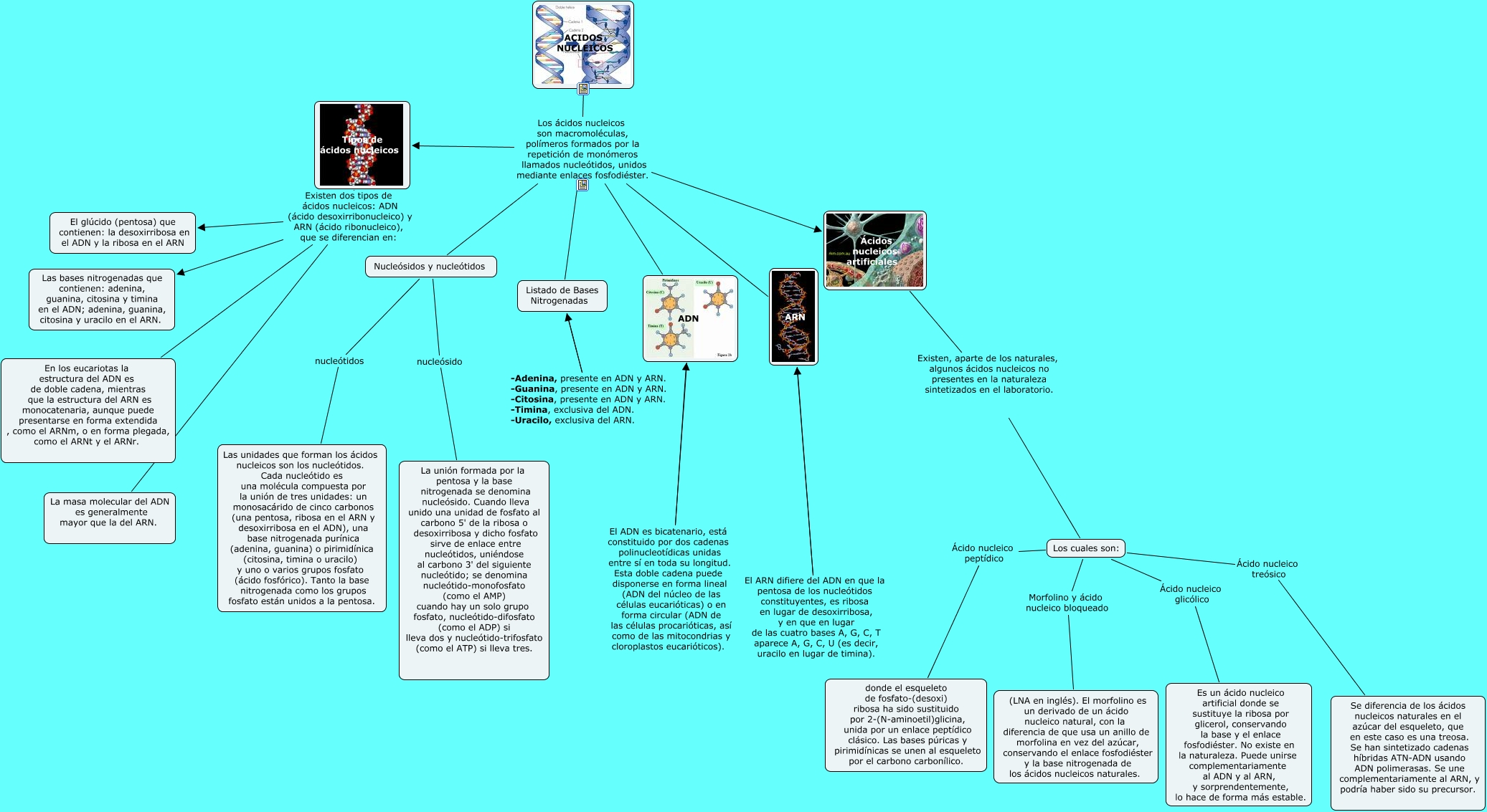 Este Cmap, tiene información relacionada con: ACIDO NUCLEICO, Los cuales son: Morfolino y ácido nucleico bloqueado (LNA en inglés). El morfolino es un derivado de un ácido nucleico natural, con la diferencia de que usa un anillo de morfolina en vez del azúcar, conservando el enlace fosfodiéster y la base nitrogenada de los ácidos nucleicos naturales., Los cuales son: Ácido nucleico glicólico Es un ácido nucleico artificial donde se sustituye la ribosa por glicerol, conservando la base y el enlace fosfodiéster. No existe en la naturaleza. Puede unirse complementariamente al ADN y al ARN, y sorprendentemente, lo hace de forma más estable., Tipos de ácidos nucleicos Existen dos tipos de ácidos nucleicos: ADN (ácido desoxirribonucleico) y ARN (ácido ribonucleico), que se diferencian en: Las bases nitrogenadas que contienen: adenina, guanina, citosina y timina en el ADN; adenina, guanina, citosina y uracilo en el ARN., ACIDOS NUCLEICOS Los ácidos nucleicos son macromoléculas, polímeros formados por la repetición de monómeros llamados nucleótidos, unidos mediante enlaces fosfodiéster. ARN, ACIDOS NUCLEICOS Los ácidos nucleicos son macromoléculas, polímeros formados por la repetición de monómeros llamados nucleótidos, unidos mediante enlaces fosfodiéster. Ácidos nucleicos artificiales, Ácidos nucleicos artificiales Existen, aparte de los naturales, algunos ácidos nucleicos no presentes en la naturaleza sintetizados en el laboratorio. Los cuales son:, ACIDOS NUCLEICOS Los ácidos nucleicos son macromoléculas, polímeros formados por la repetición de monómeros llamados nucleótidos, unidos mediante enlaces fosfodiéster. Listado de Bases Nitrogenadas, Tipos de ácidos nucleicos Existen dos tipos de ácidos nucleicos: ADN (ácido desoxirribonucleico) y ARN (ácido ribonucleico), que se diferencian en: La masa molecular del ADN es generalmente mayor que la del ARN., Nucleósidos y nucleótidos nucleótidos Las unidades que forman los ácidos nucleicos son los nucleótidos. Cada nucleótido es una molécula compuesta por la unión de tres unidades: un monosacárido de cinco carbonos (una pentosa, ribosa en el ARN y desoxirribosa en el ADN), una base nitrogenada purínica (adenina, guanina) o pirimidínica (citosina, timina o uracilo) y uno o varios grupos fosfato (ácido fosfórico). Tanto la base nitrogenada como los grupos fosfato están unidos a la pentosa., ACIDOS NUCLEICOS Los ácidos nucleicos son macromoléculas, polímeros formados por la repetición de monómeros llamados nucleótidos, unidos mediante enlaces fosfodiéster. Tipos de ácidos nucleicos, Nucleósidos y nucleótidos nucleósido La unión formada por la pentosa y la base nitrogenada se denomina nucleósido. Cuando lleva unido una unidad de fosfato al carbono 5' de la ribosa o desoxirribosa y dicho fosfato sirve de enlace entre nucleótidos, uniéndose al carbono 3' del siguiente nucleótido; se denomina nucleótido-monofosfato (como el AMP) cuando hay un solo grupo fosfato, nucleótido-difosfato (como el ADP) si lleva dos y nucleótido-trifosfato (como el ATP) si lleva tres., Tipos de ácidos nucleicos Existen dos tipos de ácidos nucleicos: ADN (ácido desoxirribonucleico) y ARN (ácido ribonucleico), que se diferencian en: El glúcido (pentosa) que contienen: la desoxirribosa en el ADN y la ribosa en el ARN, Los cuales son: Ácido nucleico peptídico donde el esqueleto de fosfato-(desoxi) ribosa ha sido sustituido por 2-(N-aminoetil)glicina, unida por un enlace peptídico clásico. Las bases púricas y pirimidínicas se unen al esqueleto por el carbono carbonílico., Tipos de ácidos nucleicos Existen dos tipos de ácidos nucleicos: ADN (ácido desoxirribonucleico) y ARN (ácido ribonucleico), que se diferencian en: En los eucariotas la estructura del ADN es de doble cadena, mientras que la estructura del ARN es monocatenaria, aunque puede presentarse en forma extendida , como el ARNm, o en forma plegada, como el ARNt y el ARNr., ACIDOS NUCLEICOS Los ácidos nucleicos son macromoléculas, polímeros formados por la repetición de monómeros llamados nucleótidos, unidos mediante enlaces fosfodiéster. ADN, ACIDOS NUCLEICOS Los ácidos nucleicos son macromoléculas, polímeros formados por la repetición de monómeros llamados nucleótidos, unidos mediante enlaces fosfodiéster. Nucleósidos y nucleótidos, Los cuales son: Ácido nucleico treósico Se diferencia de los ácidos nucleicos naturales en el azúcar del esqueleto, que en este caso es una treosa. Se han sintetizado cadenas híbridas ATN-ADN usando ADN polimerasas. Se une complementariamente al ARN, y podría haber sido su precursor.