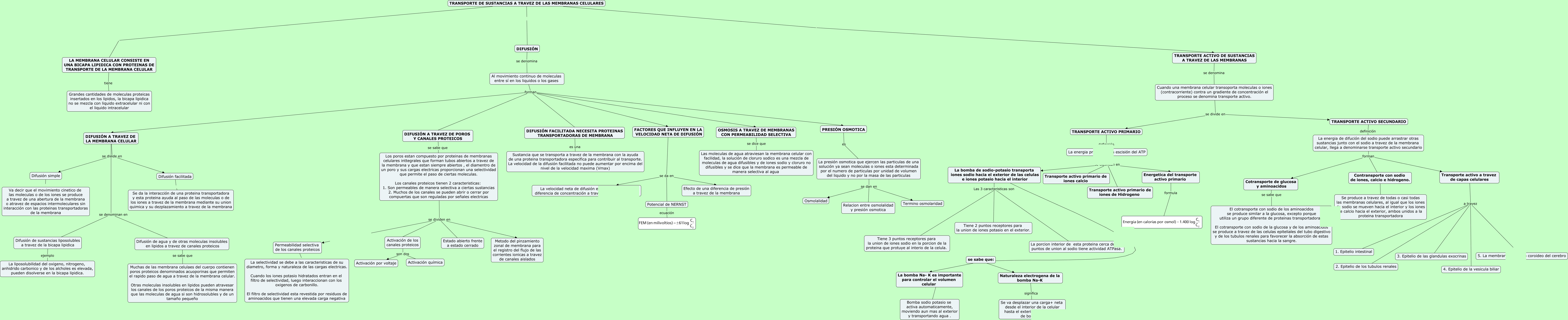 Este Cmap, tiene información relacionada con: HORMONAS, La presión osmotica que ejercen las particulas de una solución ya sean moleculas o iones esta determinada por el numero de particulas por unidad de volumen del liquido y no por la masa de las particulas se dan en Osmolalidad, La bomba de sodio-potasio transporta iones sodio hacia el exterior de las celulas e iones potasio hacia el interior Las 3 caracteristicas son Tiene 3 puntos receptores para la union de iones sodio en la porcion de la proteina que protuye al interio de la celula., LA MEMBRANA CELULAR CONSISTE EN UNA BICAPA LIPIDICA CON PROTEINAS DE TRANSPORTE DE LA MEMBRANA CELULAR tiene Grandes cantidades de moleculas proteicas insertados en los lipidos, la bicapa lipidica no se mezcla con liquido extracelular ni con el liquido intracelular, Transporte activo a travez de capas celulares a travez 3. Epitelio de las glandulas exocrinas, Cotransporte de glucosa y aminoacidos se sabe que El cotransporte con sodio de los aminoacidos se produce similar a la glucosa, excepto porque utiliza un grupo diferente de proteinas transportadoras. El cotransporte con sodio de la glucosa y de los aminoacidos se produce a travez de las celulas epiteliales del tubo digestivo y de los tubulos renales para favorecer la absorción de estas sustancias hacia la sangre., La bomba de sodio-potasio transporta iones sodio hacia el exterior de las celulas e iones potasio hacia el interior Las 3 caracteristicas son La porcion interior de esta proteina cerca de los puntos de union al sodio tiene actividad ATPasa., DIFUSIÓN A TRAVEZ DE LA MEMBRANA CELULAR se divide en Difusión simple, Al movimiento continuo de moleculas entre sí en los liquidos o los gases forman DIFUSIÓN A TRAVEZ DE LA MEMBRANA CELULAR, Activación de los canales proteicos son dos Activación química, La bomba de sodio-potasio transporta iones sodio hacia el exterior de las celulas e iones potasio hacia el interior Las 3 caracteristicas son Tiene 2 puntos receptores para la union de iones potasio en el exterior., Los poros estan compuesto por proteinas de membranas celulares inttegrales que forman tubos abiertos a travez de la membrana y que estan siempre abiertos , el diamentro de un poro y sus cargas electricas proporcionan una selectividad que permite el paso de ciertas moleculas. Los canales proteicos tienen 2 caracteristicas: 1. Son permeables de manera selectiva a ciertas sustancias 2. Muchos de los canales se pueden abrir o cerrar por compuertas que son reguladas por señales electricas se dividen en Estado abierto frente a estado cerrado, TRANSPORTE ACTIVO PRIMARIO definición La energia procede de la escisión del ATP, Al movimiento continuo de moleculas entre sí en los liquidos o los gases forman DIFUSIÓN A TRAVEZ DE POROS Y CANALES PROTEICOS, La energia de difución del sodio puede arrastrar otras sustancias junto con el sodio a travez de la membrana celular, llega a denominarse transporte activo secundario forman Contransporte con sodio de iones, calcio e hidrogeno., Difusión facilitada Se da la interacción de una proteina transportadora y esta proteina ayuda al paso de las moleculas o de los iones a travez de la membrana mediante su union quimica y su dezplazamiento a travez de la membrana, Transporte activo a travez de capas celulares a travez 2. Epitelio de los tubulos renales, DIFUSIÓN A TRAVEZ DE LA MEMBRANA CELULAR se denominan en Difusión de agua y de otras moleculas insolubles en lipidos a travez de canales proteicos, Difusión de sustancias liposolubles a travez de la bicapa lipidica ejemplo La liposolubilidad del oxigeno, nitrogeno, anhidrido carbonico y de los alcholes es elevada, pueden disolverse en la bicapa lipidica., La energia de difución del sodio puede arrastrar otras sustancias junto con el sodio a travez de la membrana celular, llega a denominarse transporte activo secundario forman Transporte activo a travez de capas celulares, Cuando una membrana celular transoporta moleculas o iones (contracorriente) contra un gradiente de concentración el proceso se denomina transporte activo. se divide en TRANSPORTE ACTIVO PRIMARIO