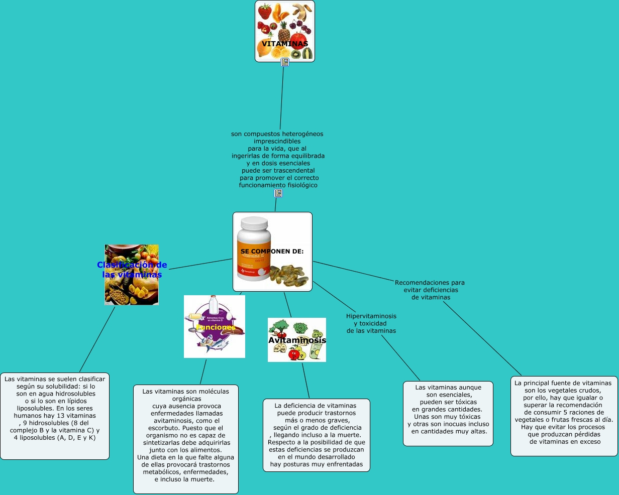 Este Cmap, tiene información relacionada con: VITAMINAS, SE COMPONEN DE: Hipervitaminosis y toxicidad de las vitaminas Las vitaminas aunque son esenciales, pueden ser tóxicas en grandes cantidades. Unas son muy tóxicas y otras son inocuas incluso en cantidades muy altas., SE COMPONEN DE: Avitaminosis La deficiencia de vitaminas puede producir trastornos más o menos graves, según el grado de deficiencia , llegando incluso a la muerte. Respecto a la posibilidad de que estas deficiencias se produzcan en el mundo desarrollado hay posturas muy enfrentadas, SE COMPONEN DE: Funciones Las vitaminas son moléculas orgánicas cuya ausencia provoca enfermedades llamadas avitaminosis, como el escorbuto. Puesto que el organismo no es capaz de sintetizarlas debe adquirirlas junto con los alimentos. Una dieta en la que falte alguna de ellas provocará trastornos metabólicos, enfermedades, e incluso la muerte., SE COMPONEN DE: Clasificación de las vitaminas Las vitaminas se suelen clasificar según su solubilidad: si lo son en agua hidrosolubles o si lo son en lípidos liposolubles. En los seres humanos hay 13 vitaminas , 9 hidrosolubles (8 del complejo B y la vitamina C) y 4 liposolubles (A, D, E y K), SE COMPONEN DE: Recomendaciones para evitar deficiencias de vitaminas La principal fuente de vitaminas son los vegetales crudos, por ello, hay que igualar o superar la recomendación de consumir 5 raciones de vegetales o frutas frescas al día. Hay que evitar los procesos que produzcan pérdidas de vitaminas en exceso, VITAMINAS son compuestos heterogéneos imprescindibles para la vida, que al ingerirlas de forma equilibrada y en dosis esenciales puede ser trascendental para promover el correcto funcionamiento fisiológico SE COMPONEN DE: