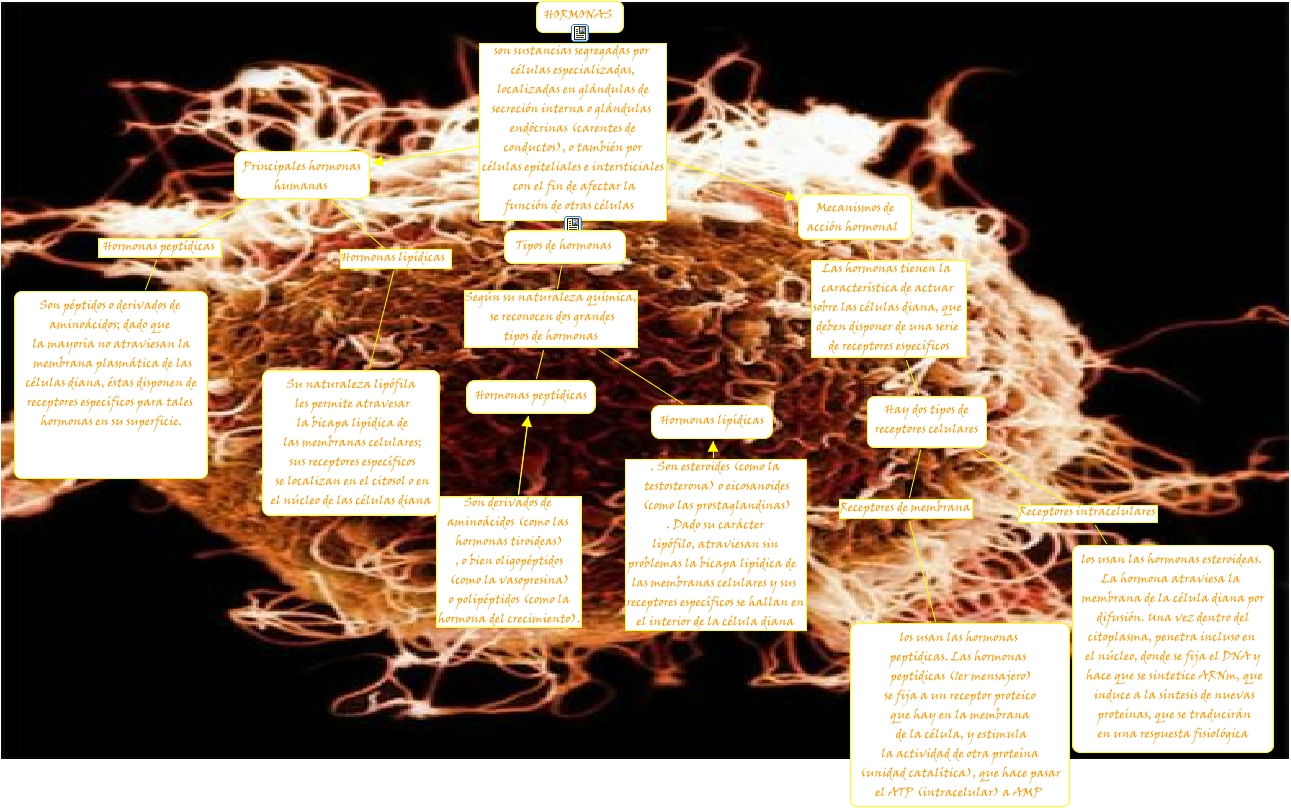 Este Cmap, tiene información relacionada con: HORMONAS SALLY, Hay dos tipos de receptores celulares Receptores de membrana los usan las hormonas peptídicas. Las hormonas peptídicas (1er mensajero) se fija a un receptor proteico que hay en la membrana de la célula, y estimula la actividad de otra proteína (unidad catalítica), que hace pasar el ATP (intracelular) a AMP, Principales hormonas humanas Hormonas lipídicas Su naturaleza lipófila les permite atravesar la bicapa lipídica de las membranas celulares; sus receptores específicos se localizan en el citosol o en el núcleo de las células diana, HORMONAS son sustancias segregadas por células especializadas, localizadas en glándulas de secreción interna o glándulas endócrinas (carentes de conductos), o también por células epiteliales e intersticiales con el fin de afectar la función de otras células Principales hormonas humanas, Mecanismos de acción hormonal Las hormonas tienen la característica de actuar sobre las células diana, que deben disponer de una serie de receptores específicos Hay dos tipos de receptores celulares, Hay dos tipos de receptores celulares Receptores intracelulares los usan las hormonas esteroideas. La hormona atraviesa la membrana de la célula diana por difusión. Una vez dentro del citoplasma, penetra incluso en el núcleo, donde se fija el DNA y hace que se sintetice ARNm, que induce a la síntesis de nuevas proteínas, que se traducirán en una respuesta fisiológica, HORMONAS son sustancias segregadas por células especializadas, localizadas en glándulas de secreción interna o glándulas endócrinas (carentes de conductos), o también por células epiteliales e intersticiales con el fin de afectar la función de otras células Mecanismos de acción hormonal, Principales hormonas humanas Hormonas peptídicas Son péptidos o derivados de aminoácidos; dado que la mayoría no atraviesan la membrana plasmática de las células diana, éstas disponen de receptores específicos para tales hormonas en su superficie., HORMONAS son sustancias segregadas por células especializadas, localizadas en glándulas de secreción interna o glándulas endócrinas (carentes de conductos), o también por células epiteliales e intersticiales con el fin de afectar la función de otras células Tipos de hormonas, Tipos de hormonas Según su naturaleza química, se reconocen dos grandes tipos de hormonas Hormonas peptídicas, Tipos de hormonas Según su naturaleza química, se reconocen dos grandes tipos de hormonas Hormonas lipídicas